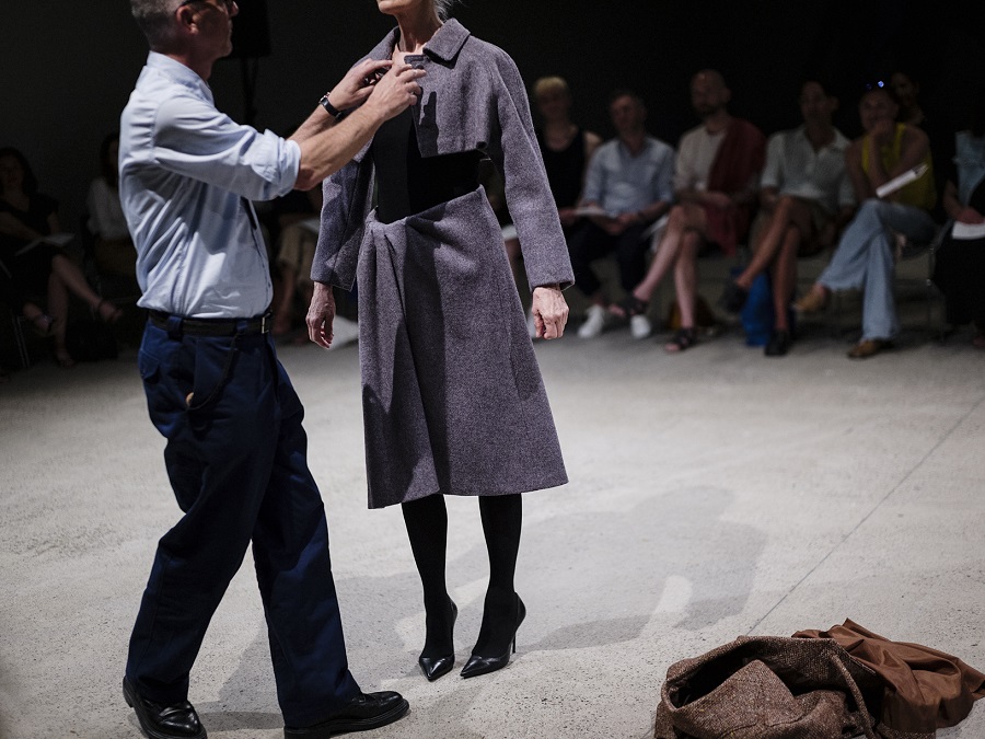 Salon de Couture (ore 18.30 con replica alle 19.30, durata 25minuti), primissima creazione di Saillard, è la prima sfilata della storia della moda a non contemplare i vestiti. Ideata nel 2006, e mai più riproposta da allora, porta in scena Violeta Sanchez, musa e modella di Yves Saint Laurent e Helmut Newton, nell’esercizio di una sfilata fantasma. Violeta pronuncia con cura, come era abitudine fare nelle maison di moda fino agli anni Cinquanta, i ricordi dei tessuti, delle forme e dei materiali dei vestiti.