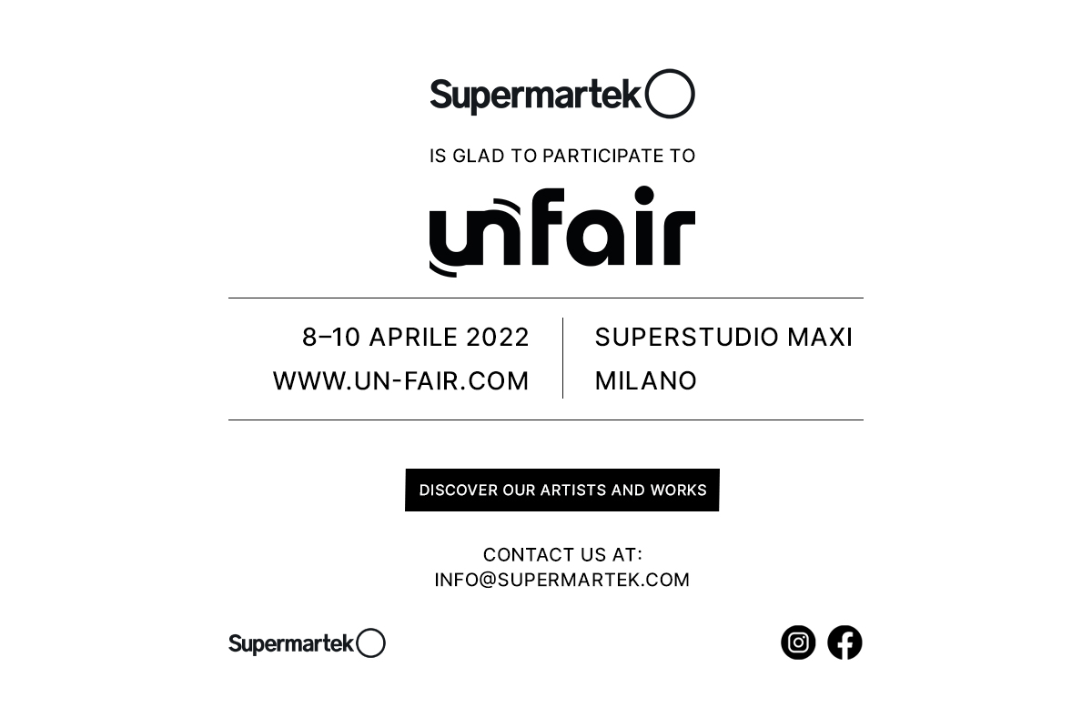 Supermartek arriva al SUPERSTUDIO MAXI di Milano per partecipare alla kermesse artistica di (un)fair. Seguendo la sua mission rappresenterà al meglio uno spaccato dei linguaggi contemporanei declinati attraverso la fotografia, la pittura, l’istallazione e nuovi materiali e tecniche. Saranno presenti opere di Edson Luli, Eolo Perfido, Elena Pizzato, Massimo Scognamiglio, Michele Tajariol, Emilio Vavarella e Olimpia Zagnoli.