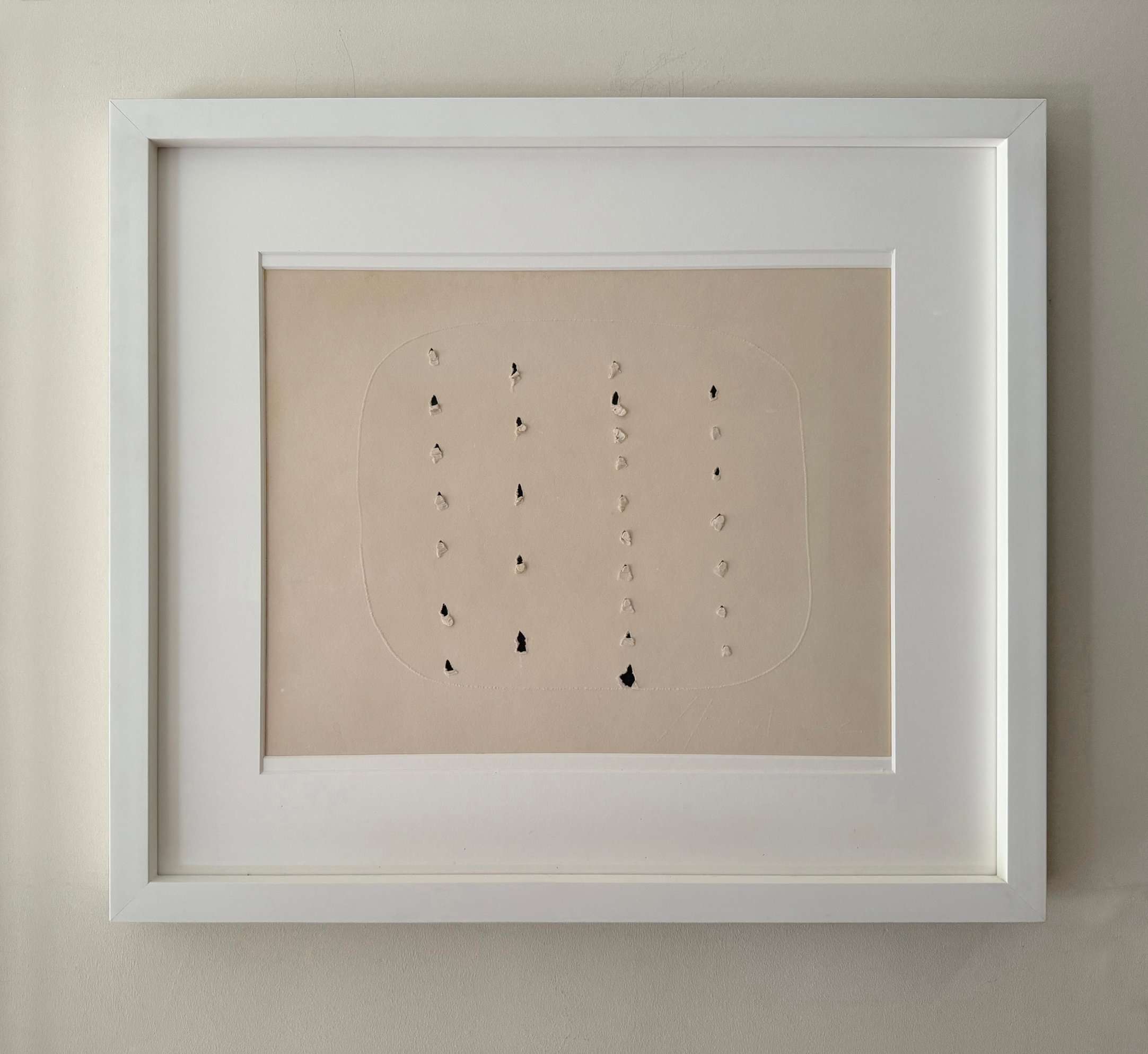 - Lucio Fontana, Concetto Spaziale, Buchi, strappi e graffito su carta assorbente bianca , 46.8×58.2 cm, 1966-68