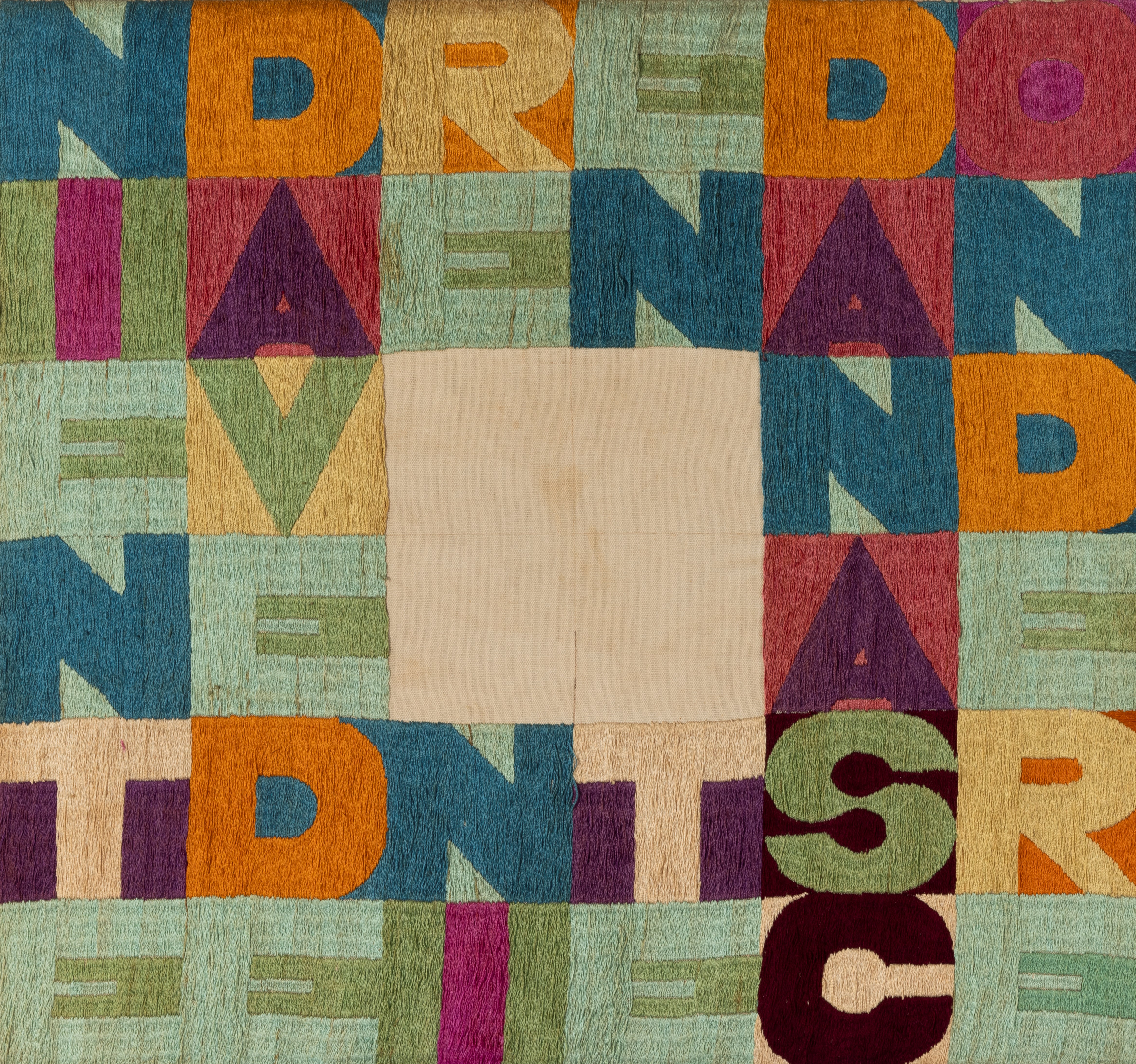 - Alighiero Boetti, Niente da vedere niente da nascondere, ricamo, cm 45×42, 1977. Courtesy Artemisia Fine Art
