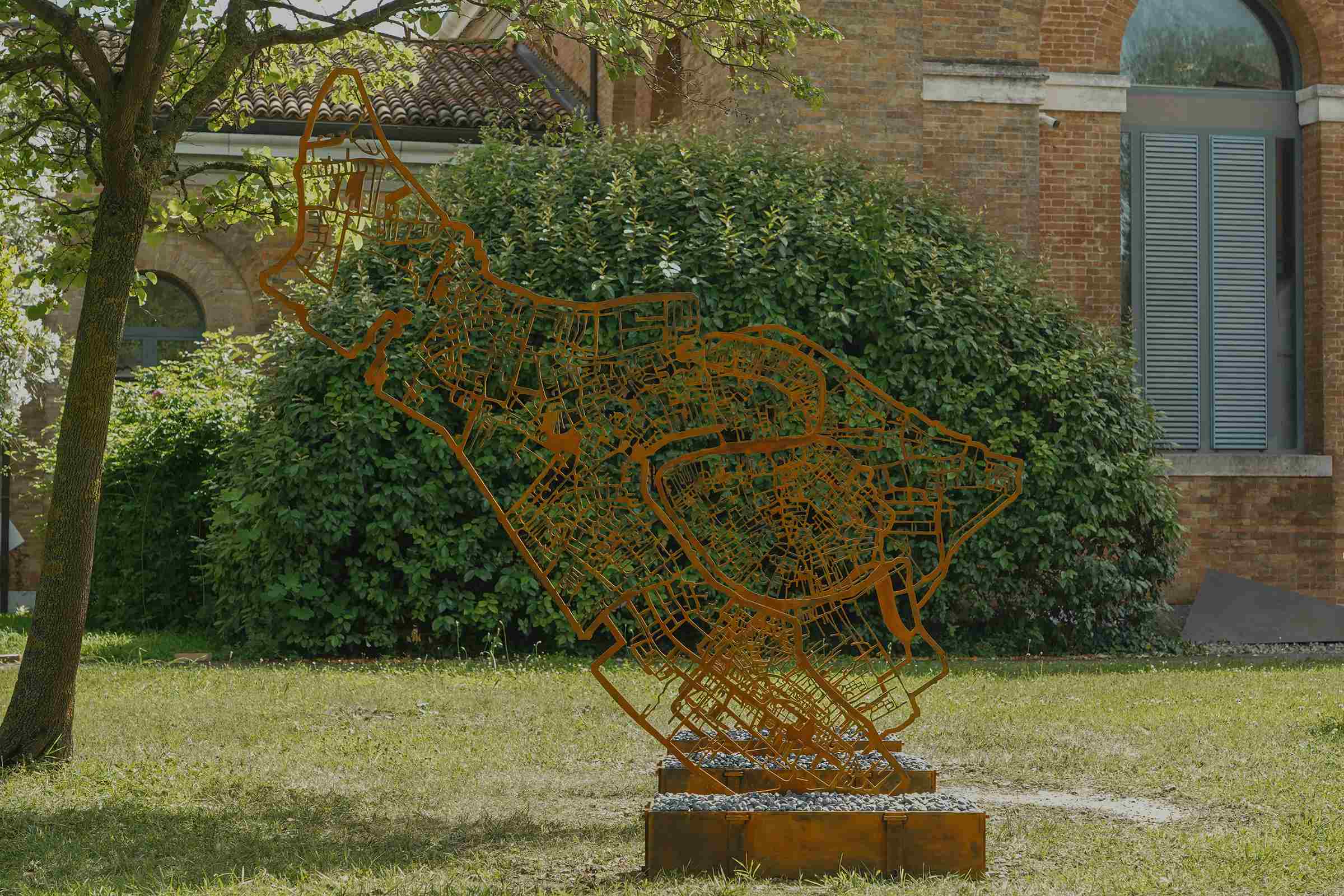 L’Artista con TRAME interpreta la città come una metamorfosi, dove la forma è intoccabile, ma il contenuto si perde nel fascino dei canali, evidenziando l’elemento acqua, come vene pulsanti della città scolpite nell’acciaio corten.