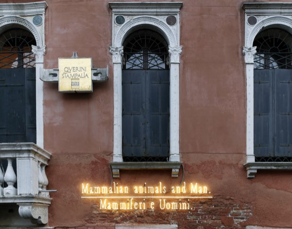 Sulla facciata del palazzo si riaccendono, dopo un importante restauro a cui la Fondazione sta lavorando da tempo, i neon di Joseph Kosuth. L’artista li ha piegati a tracciare parole: terra, aria, acqua… Elementi primordiali che comunicano con l’architettura cinquecentesta, creando una relazione tra passato e contemporaneità: un gioco linguistico e visivo che invita a riflettere sul ruolo dell’arte. La materia dell’ornamento, installazione permanente realizzata nel 1997 per la Biennale Arte, nell’ambito del progetto Sarajevo 2000, è ispirata a ‘Le pietre di Venezia’ di John Ruskin (1853) ed è una sorta di manifesto della Querini Stampalia, perché esprime visivamente la sua missione: conservare il futuro.