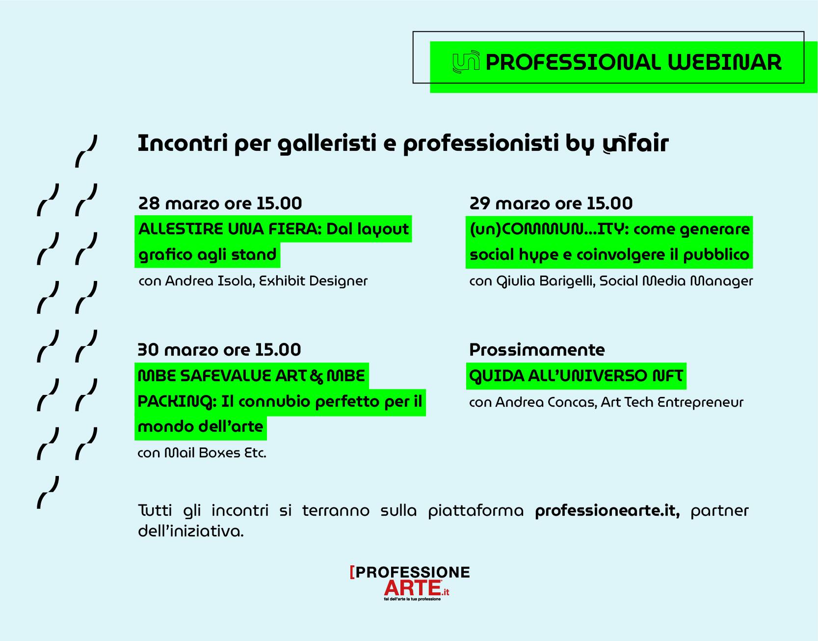 A poco più di una settimana dall’inaugurazione della nuova fiera d’arte, (un)fair lancia una serie di webinar per le gallerie che parteciperanno alla fiera, ma non solo. Dal 28 Marzo, parte la prima di una serie di spunti utili per tutte le gallerie e i professionisti del mondo dell’arte: dalla concezione degli allestimenti con Andrea Isola, Exhibit Designer, a spunti sull’universo dei social media con Giulia Barigelli, Social Media Manager, a una guida sulla movimentazione delle opere a regola d’arte in occasione di fiere o per la spedizione delle opere con soluzioni ecosostenibili, in collaborazione con Mail Boxes Etc. e, prossimamente, una guida per avvicinarsi all’universo NFT con Andrea Concas, Art Tech Entrepreneur – CEO & Founder Art Rights