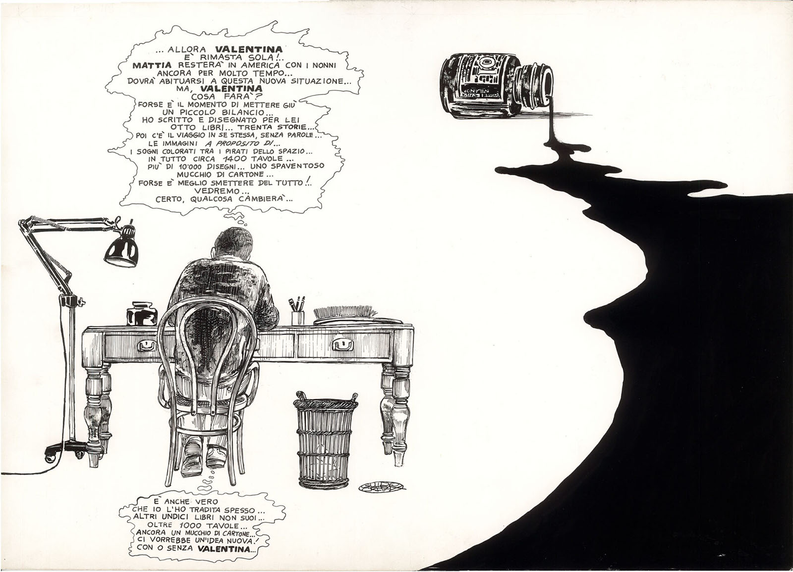 - Guido Crepax, Disegno per il volume “Valentina sola”, 1980, Inchiostro di china su cartoncino Schoeller, 51 x 36,5 cm; © Archivio Crepax