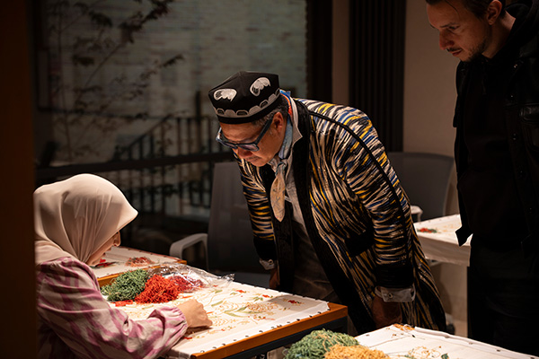 - Architect and curator of When Apricots Blossom, Kulapat Yantrasast at Suzani embroidery workshop in Tashkent. Photo courtesy of ACDF