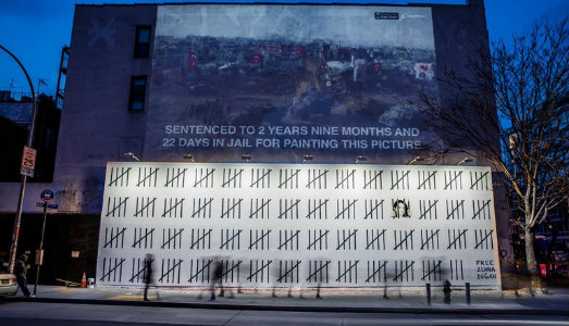 Una superficie di circa 21 metri è ricoperta da grandi segni neri che ricordano quei calendari che, tipicamente, si trovano sulle pareti delle celle, per calcolare i giorni di detenzione. Il riferimento è all’artista e giornalista Zehra Dogan che, a marzo dell’anno scorso, fu condannata a tre anni di carcere, per aver ritratto la bandiera turca sullo sfondo di palazzi in macerie. Si tratta della città curda di Nusaybin, che fu quasi totalmente distrutta nel 2015, durante i combattimenti tra l’esercito turco e i militanti curdi. E tra i segni neri, che contano i giorni già trascorsi in carcere, compare un ritratto a stencil della donna, con una matita ben salda nella mano sinistra. «Mi sento molto vicino a lei. Ho dipinto cose molto più idonee a ottenere una pena detentiva», ha dichiarato Banksy al New York Times.