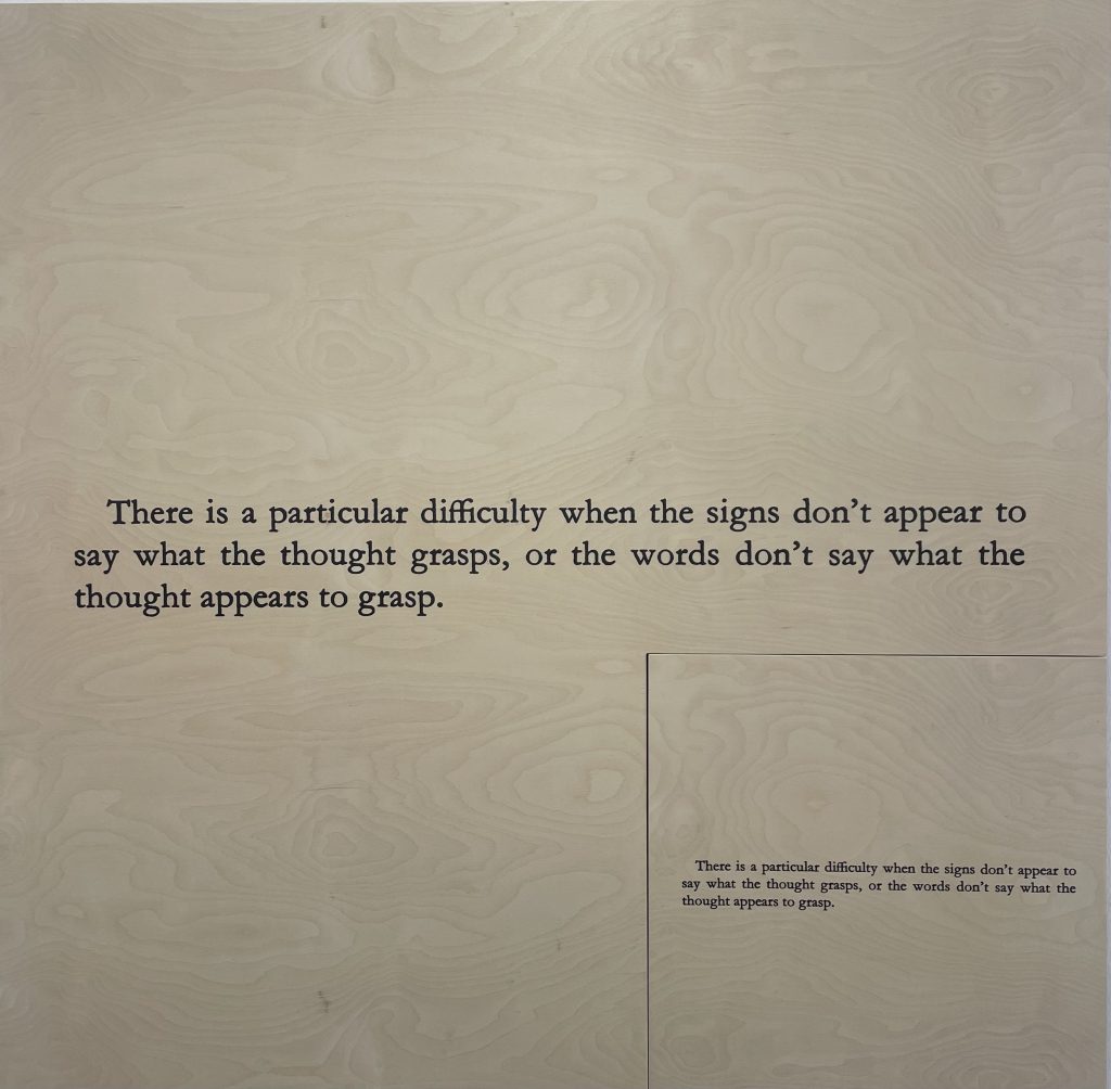 Unitarie nella loro apparenza e dirette nel loro discorso, molte opere sembrano impostare un’etica differente, basata sul vedere di più, udire di più, sentire di più, recuperando i nostri sensi, anche in un tempo nichilista come il nostro, che preme l’acceleratore sull’eccesso e la sovrapproduzione, da cui consegue una costante diminuzione di acutezza della nostra esperienza sensoriale. «There is a particular difficulty when the signs don’t appear to say what the tought grasps, or the words don’t say what the thought appears to grasp» sentenzia Joseph Kosuth – in un metro per un metro che Vistamare propone insieme a un’urgente ammonizione: «Dum loquor, hora fugit. While I speack, the tima flies» (MAXIMA PROPOSITO. OVIDIO #8).