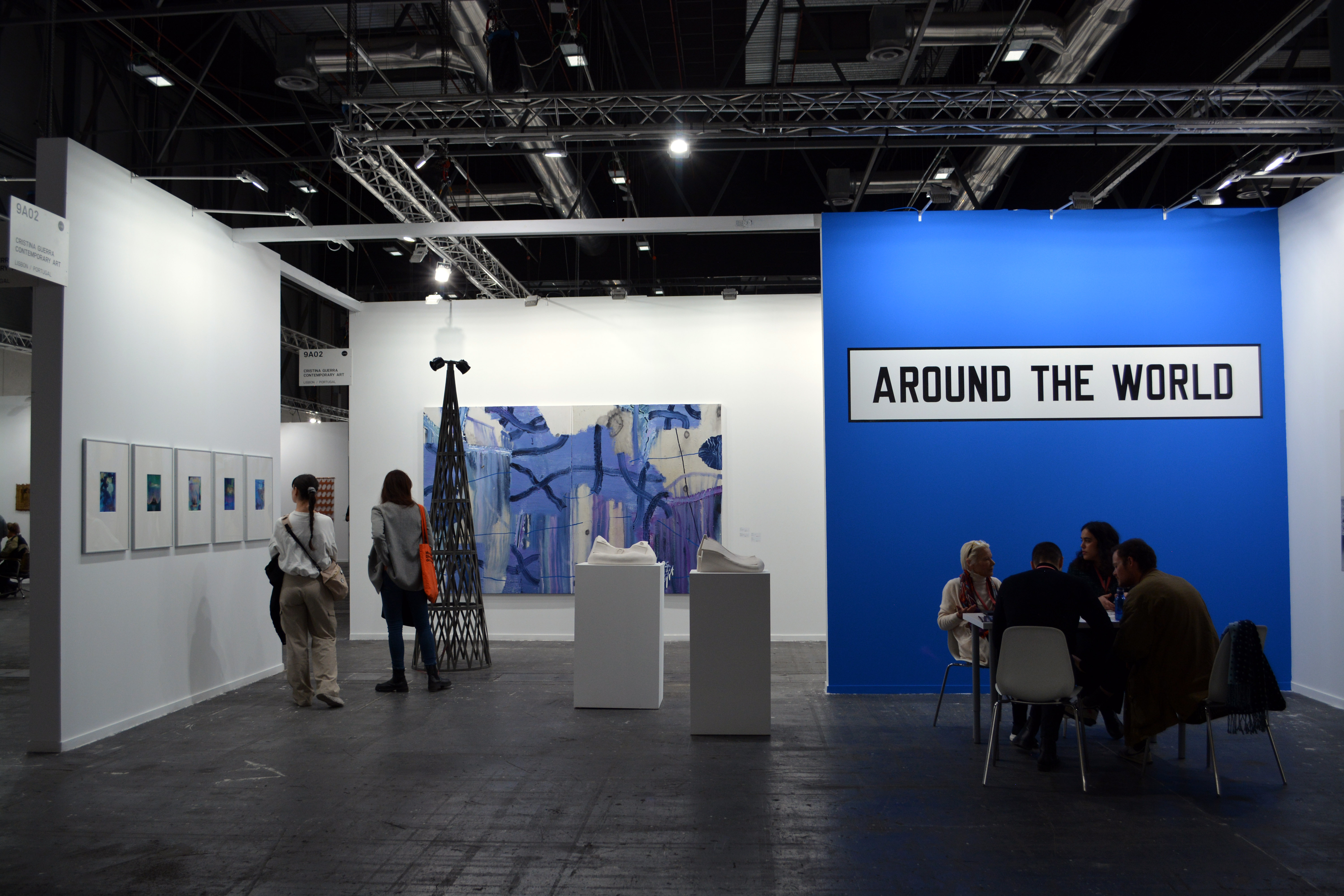 La lunga carta occupa un’intera parete dello stand della galleria Monitor Roma, Lisbona, Pereto (AQ), con quel suo paesaggio astratto “fluttuante” di grande intensità poetica, come del resto lo è l’opera L’Erbario che Montessori ha realizzato nel 1978, tra le acquisizioni a ARCOmadrid 2024 del Museo Nacional Centro de Arte Reina Sofía di Madrid. Due artiste appartenenti a generazioni diverse: entrambe le opere, tra l’altro, sono state già esposte in altri contesti, la prima nel 2021 al Malba – Museo de Arte Latinoamericano Buenos Aires e la seconda nella personale La camera bianca (2020) alla Fondazione Giuliani di Roma. Di rimandi al colore azzurro ce ne sono tantissimi, intercettabili in numerose altre opere d’arte contemporanea tra le centinaia in vendita nelle hall 7 e 9 del complesso fieristico di Ifema Madrid che firma l’organizzazione dell’evento: ci sono i moduli di acciaio inossidabile ed altri materiali in Cirrocumulus Uncinus Fluctus/M+I di Tomás Saraceno (neugerriemschneider, Berlino) ed è azzurra la parete che accoglie l’installazione testuale Around the world di Lawrence Weiner (Cristina Guerra Contemporary Art, Lisbona), così come i cieli della serie Paisajes dipinti ad olio da Daniela Ortiz (Àngels Barcelona, Barcellona) che raffigurano temi legati al razzismo, al patriarcato e all’immigrazione citando anche l’attivista Lolita Lebrón (1919-2010), figura carismatica della scena politica portoricana. Di respiro internazionale, ARCOmadrid con la presenza di 205 gallerie di 36 paesi si conferma come piattaforma di riferimento in Europa per l’arte del Centro e Sud America con ben 38 gallerie, in particolare dall’Argentina, Brasile e Messico e l’organizzazione di una seconda sezione dal titolo Never the same. Latin American art, a cura di Manuela Moscoso e José Esparza Chong Cuy in cui è evidenziato il rapporto con la tradizione e il patrimonio culturale.
