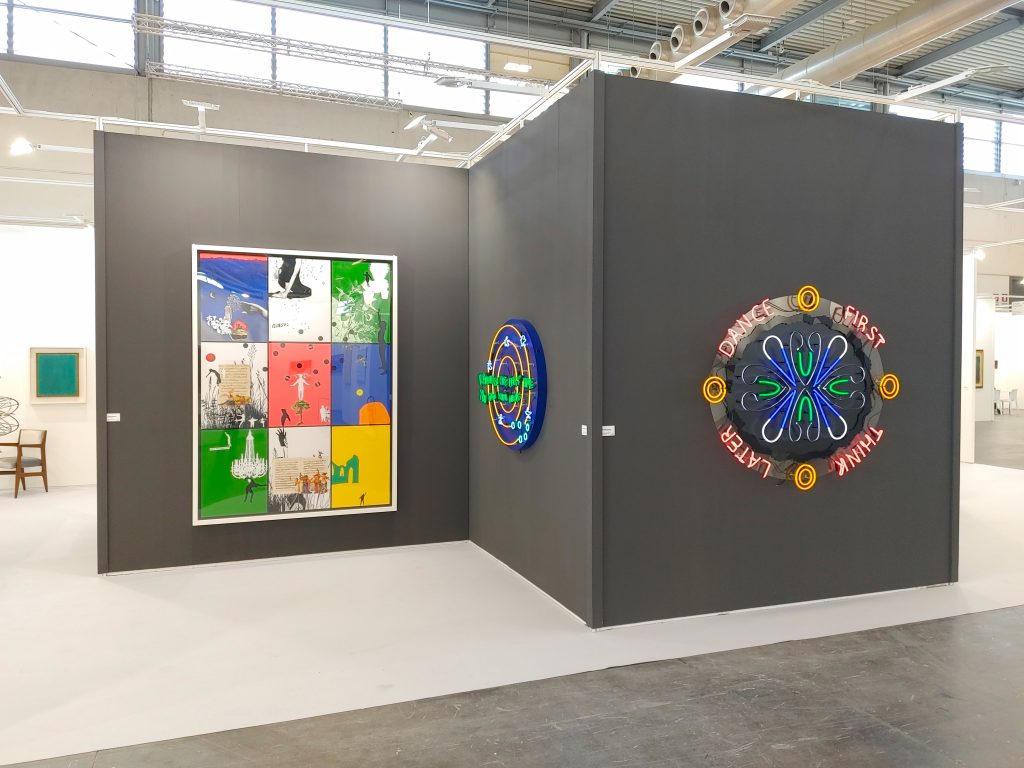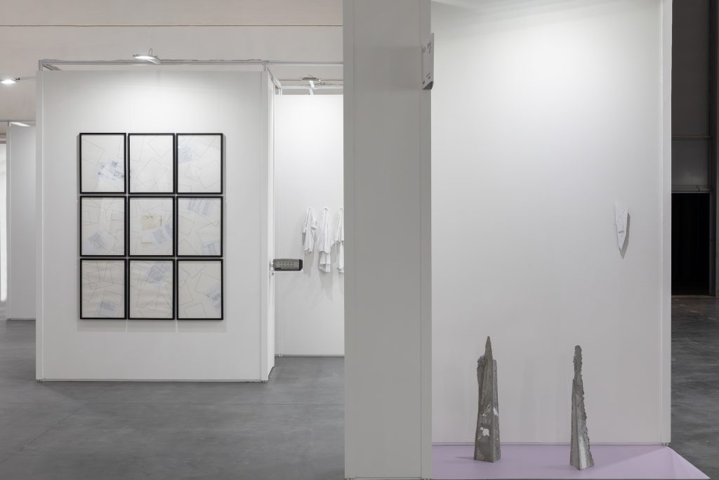 Atipografia sceglie di accostare artisti con cui ha iniziato la propria attività, come Arcangelo Sassolino, con un cemento a parete che – con soddisfazione – ha trovato collocazione fin dalle prime ore di apertura – Mats Bergquist, Mirco Baricchi e Diego Soldà, con artisti più giovani come Yulia Iosilzon e Josh Rowell (ora in mostra ad Arzignano). A 360° è la proposta di Galleria Studio G7, che ha pensato a una doppia linea di proposta. All’esterno, Linea di Materia, è una riflessione sulle declinazioni di materia e materiali che prende le mosse con la serie Sectilia di Caterina Morigi (in marmo artificiale, una miscela di pigmenti, scagliola, e colla animale) e si conclude con l’installazione di Aleksander Pektov, che ricrea con cemento e argilla appunti grafici delle architetture che predilige. All’interno dello stand invece spazio a Jacopo Mazzonelli, Daniela Comani, Franco Guerzoni, Marilisa Cosello, Dravid Tremlett e Giulio Paolini, con la grande Ni le soleil, ni la mort… (tutte le opere esposte), 1998, esposta per la seconda volta nella sua storia.