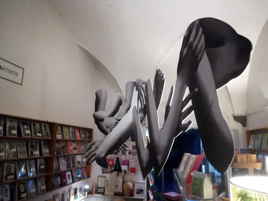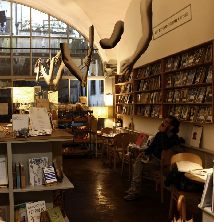Marta dell’Angelo (1970), per la libreria, ha pensato a una singolare installazione site-specific, Tableau Vivant 2020 (inaugurazione venerdì, 16 ottobre, ore 18.30) che si pone sulla scia della sua ricerca, portata avanti da lungo tempo, che esplora la possibilità di rappresentazione del corpo umano attraverso i diversi linguaggi dell’arte e focalizzandosi sul gesto e la postura. Dell’Angelo, infatti, ha appeso al soffitto, quasi a sfiorare la testa delle persone, sagome di braccia, a grandezza naturale; sono immagini tratte da un suo dipinto a olio, fotografate e stampate su alluminio. Braccia che rimandano alla forza lavoro evocata da Boccioni nella Città che sale e che sembrano vagare nel vuoto muovendosi in continuazione a seconda degli spostamenti dell’aria e proponendo quindi punti di vista sempre diversi.