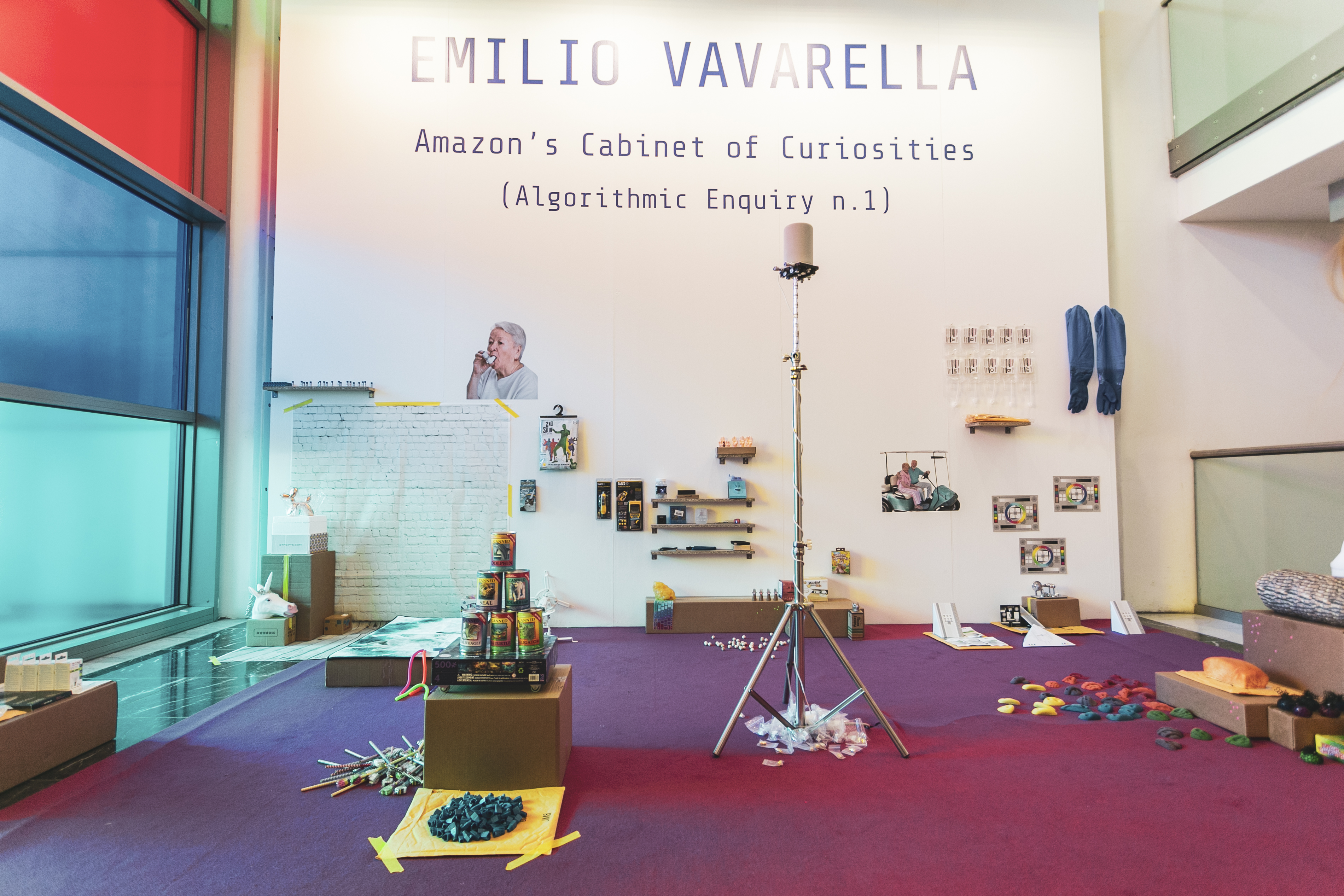 Solo pochi metri più avanti, appena si entra in fiera, lo scenarEmmuta completamente e l’attualità del rapporto tra intelligenza umana e intelligenza artificiale diventa protagonista nell’opera di Emilio Vavarella svelata oggi e legata al Festival art+b=love(?): Amazon’s Cabinet of Curiosities (Algorithmic Enquiry n. 1), che nei mesi precedenti alla fiera ha “affidato” le scelte per la realizzazione di un’opera d’arte ad Alexa, l’assistente virtuale di Amazon Echo, e che oggi ha coinvolto in un workshop quattordici imprenditori chiamati a confrontarsi con i materiali e gli oggetti scelti da Alexa.