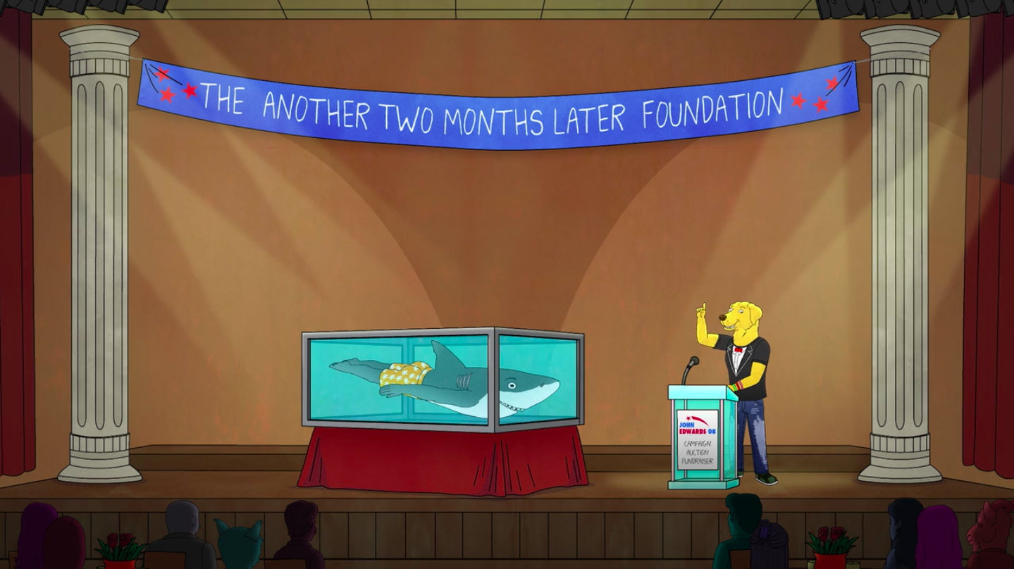 Il dipinto ha un ruolo fondamentale anche nell’ultima stagione, uscita proprio in queste ultime settimane. BoJack dà una svolta alla sua vita e decide di dare via l’opera di Hockney – come a volersi disfare di ciò che rappresenta. Per questo lo regala a Princess Carolyn, per il figlioletto che ha adottato. Un dono a titolo gratuito, che fa da contraltare alla cifra record con cui il quadro di Hockney è stato battuto all’asta l’anno scorso nel mondo reale: 90,3 milioni all’asta da Christie’s. Coincidenze? Considerata l’abilità strategica dei produttori, noi non lo crediamo affatto.