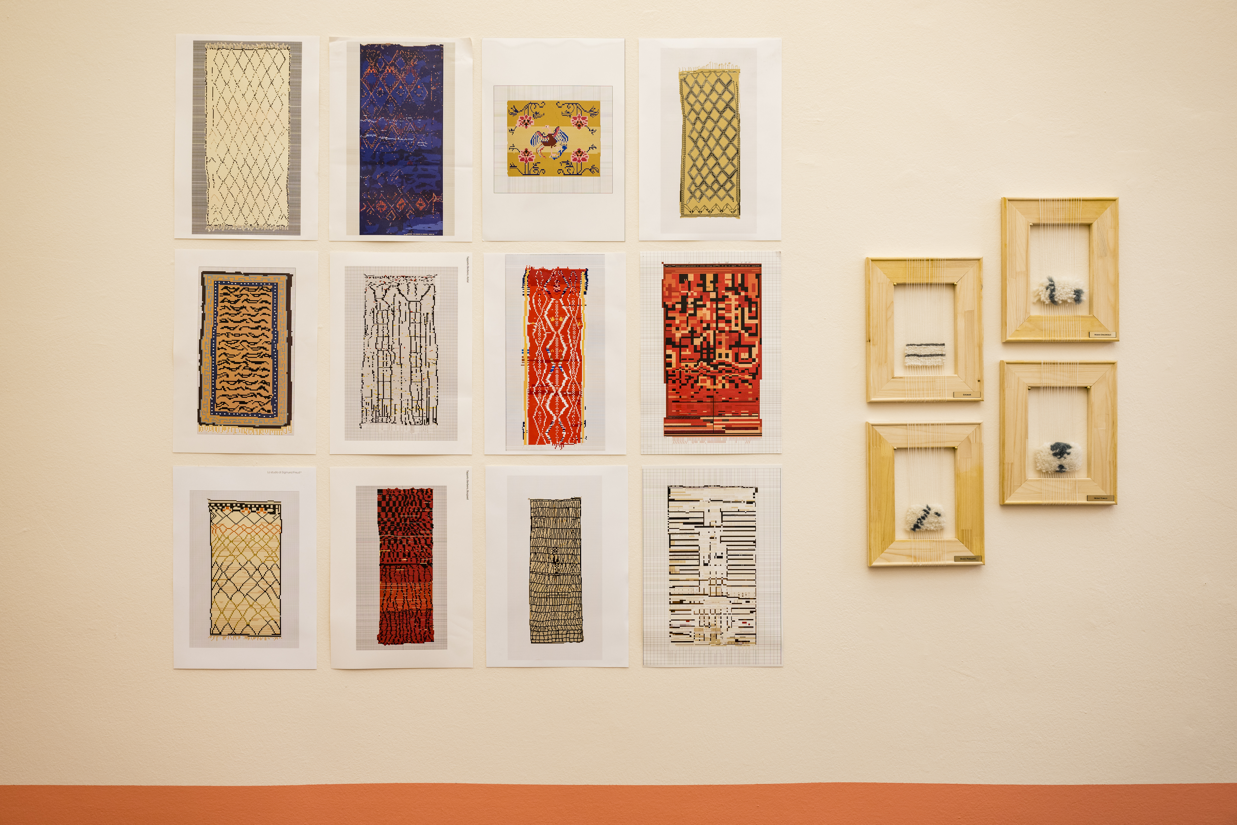 Camilla Bosio, Giorgia Buratto, Valentina Correnti, Annika Ferrero, Alberto Frua, Alice Giordano, Letizia Mancuso, Cristina Polstenicu, Giulia Scagnetto, Asja Starace, Lucrezia Stravicino, Luna Giovanna Testa, Virginia Urro, sono gli studenti coinvolti. Guidati dalla coordinatrice del corso e relatrice di Tesi Adelaide Testa, co-fondatrice dello studio di architettura Macante-Testa e dalla docente e correlatrice di Tesi Giorgia Scioratto, sono partiti da una fase di ricerca storica sui tappeti antichi, berberi e tibetani della collezione Battilossi e sulle tecniche di tessitura. Queste ultime hanno permesso un’analisi dei livelli di stratificazione del tappeto, dall’ordito alla trama, che gli studenti hanno riportato virtualmente in un progetto di tessitura digitale eseguito con Microsoft Excel: con questo utilizzo insolito del software, le celle del foglio di calcolo si sono trasformate in unità figurative assimilabili ai pixel: attraverso i colori di riempimento e i segni tipografici, sono stati descritti il disegno e il vello del tappeto.