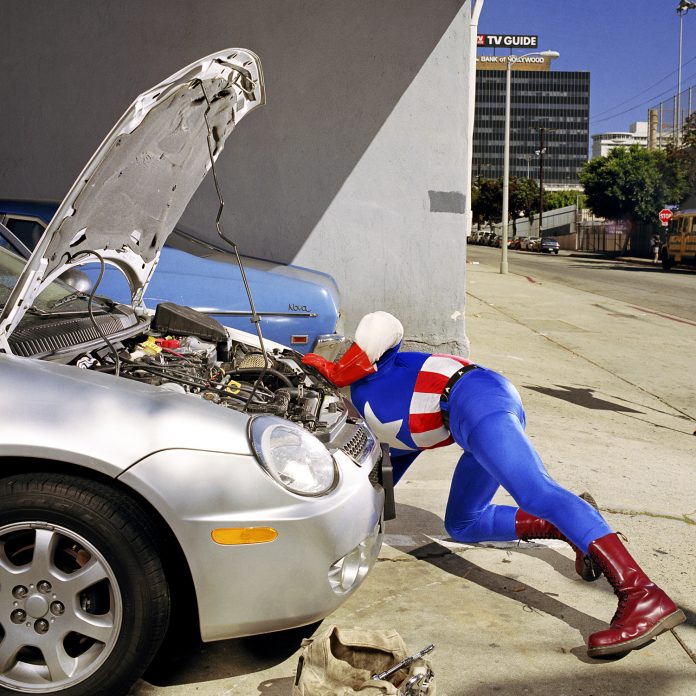 Gregg Segal nella sua serie Superheroes at home segue gli imitatori di supereroi di Hollywood a casa e li fotografa mentre sono alle prese con le faccende domestiche.