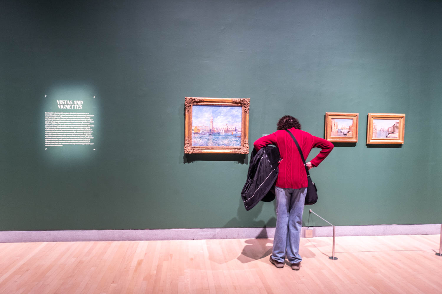 Insieme a una selezione di opere che ricoprono tutta la carriera di Monet, figurano anche 19 dei suoi dipinti veneziani. Monet una volta affermò che Venezia era «Troppo bella per essere dipinta», una sfida che egli accettò. La visione singolare dell’artista è anche messa in dialogo con le rappresentazioni della città di artisti come Canaletto, Paul Signac, John Singer Sargent e Pierre-Auguste Renoir. Mentre altri si concentravano su strade e canali piene di persone, l’interpretazione di Monet è priva di presenza umana. Al contrario, cattura l’interazione tra l’architettura, il colore e la luce, avvolgendo gli spettatori, che arrivano nelle sale infreddoliti, nell’atmosfera azzurra della città tra le suggestioni sonore di Niles Luther, compositore attualmente in residenza artistica al museo.