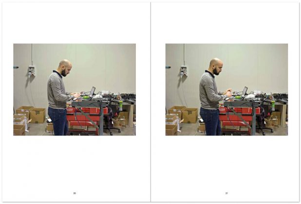 Il volume si completa con un saggio di Maurizio Guerri, dal titolo “Aprire gli occhi sull’accordo intraspecifico”, che riprende le pagine “Sul dolore” (1937) di Ernst Jünger. Nel testo, Guerri analizza lo studio dietro le immagini di Guerrieri, partendo da lavori precedenti, come “The Dairy” (2015) e “New Lands” (2017) fino al presente “Corpi e macchine a Lavoro”. «Guerrieri è entrato dentro altri luoghi, i luoghi del lavoro altamente informatizzato […]. Quello che Guerrieri con le sue immagini ci permette di vedere è che nei luoghi di lavoro non si tratta solo di rapporti tra intelligenze “naturali” e “artificiali”: si tratta ancora di rapporti tra corpi e macchine, si tratta ancora di fatica di occhi e di muscoli, si tratta ancora di posture e di gesti».