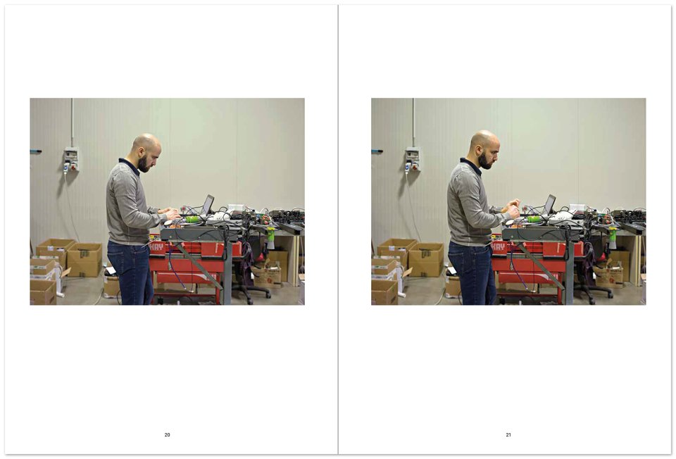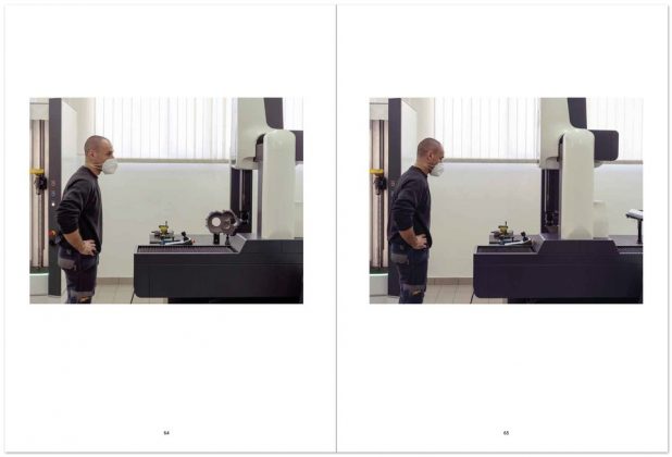 Cosa è cambiato nel 2019? Guerrieri se lo è chiesto ed ha attuato un lavoro di approfondimento, non solo visivo ma anche teorico sul settore dell’automotive e sul controllo dei processi industriali. L’indagine si è modellata sullo studio antropologico del lavoro da un punto di vista umano ma sempre più subordinato a una dipendenza dalle macchine.