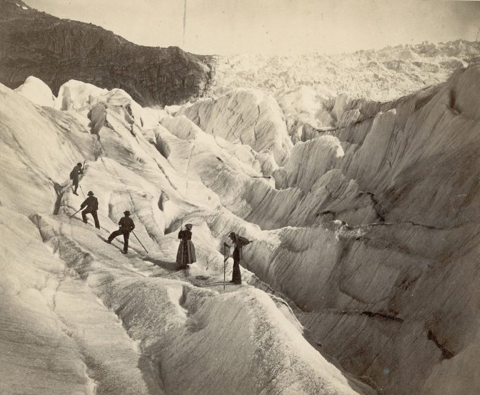 Di lì a breve, la fotografia si rivelerà un veicolo potentissimo per la pubblicità turistica, processo favorito dallo sviluppo delle infrastrutture di trasporto svizzere, che va di pari passo con la semplificazione del processo fotografico (grazie all’uso dei negativi in vetro e stampe all’albumina). Nascono così motivi popolari e “mete” turistiche, come la cascata di Staubbach nella valle di Lauterbrunnen, immortalata da Francis Frith o il fiume Rodano di Adolphe Braun, che cattura le infinite distese del ghiacciaio attraversato da un gruppo di scalatori, tra cui anche una donna.