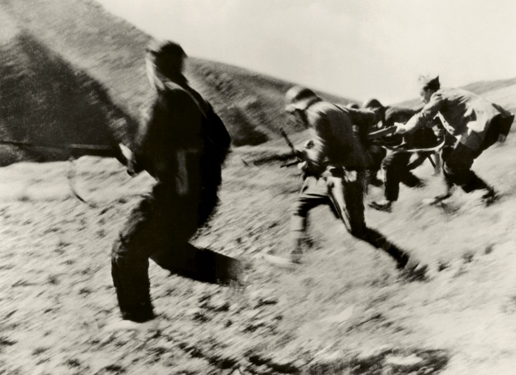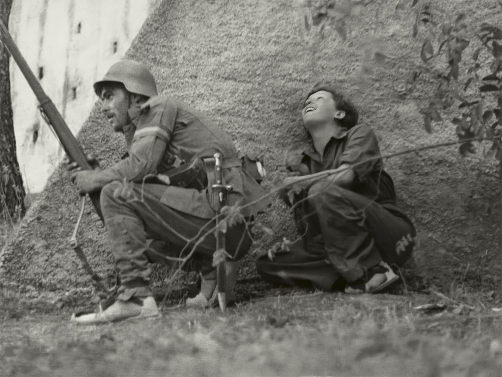 Robert Capa incontrò Gerda Taro nel contesto tanto romantico quanto drammatico della Parigi degli anni Trenta. I due si innamorarono e, in seguito, partirono insieme per la Spagna per documentare la sanguinosa guerra civile allora in atto. Gerda Taro pagò in prima persona il proprio impegno come fotografa e testimone dei fatti storici di quegli anni, perdendo la vita nel 1937, proprio nel contesto della guerra civile spagnola, la stessa di cui parlò Orwell nel suo Omaggio alla Catalogna del 1938. La tragica circostanza rende ancora più poetica e profonda la sua testimonianza per immagini, alcune delle quali sono destinate a restare intramontabili nella memoria e nell’immaginario collettivi. Tra queste, risalta tra tutte la fotografia, non a caso scelta come locandina della mostra, in cui vediamo una miliziana nell’atto di imbracciare un fucile. La donna indossa una tuta da combattimento, sta prendendo la mira ed è pronta a sparare, eppure, allo stesso tempo, indossa un paio di scarpe col tacco.