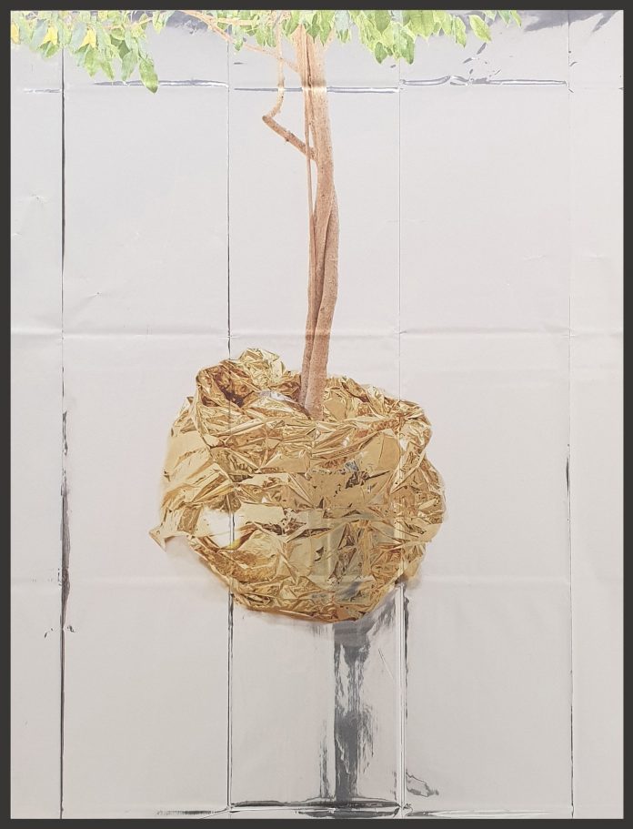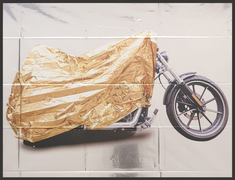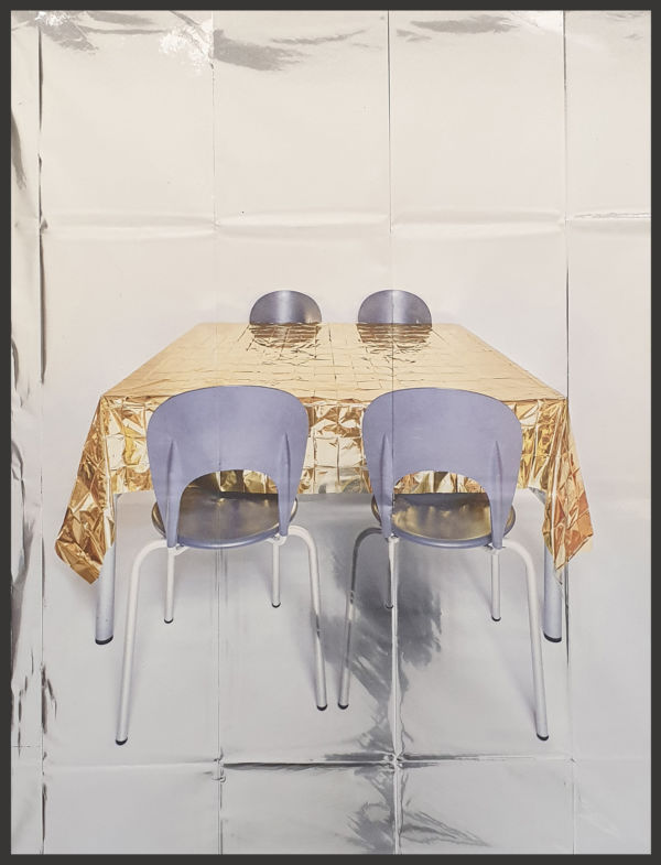 Fissate nell’uso improprio cui sono stati destinati, le immagini di quei teli d’oro sono stampate sul lato d’argento per intrecciare la risonanza delle due facce. Usati per proteggere dalla pioggia la motocicletta, per avvolgere una pianta di limoni, come una tenda della doccia, per racchiudere una zolla di terreno intorno alle radici di un albero espiantato, da tovaglia per un tavolo di cucina, cartoccio per un pollo (?) in una teglia da infornare. E altri ancora altrettanto fantasiosi e ingegnosi.