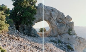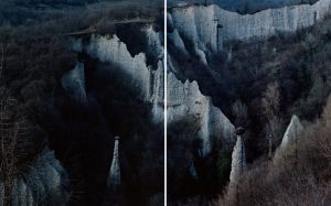 Un contrasto tra le forme geologiche indagate da Barile e i paesaggi archeologici mediorientali di Milella, colti in una dimensione romantica, vicina ai dipinti di Caspar David Friedrich e agli scatti del tedesco Axel Hutte, allievo di Bernt e Hilla Becher. Tra le sei grandi foto esposte alle Terme, spiccano per intensità Nemrut Dagi (2013), scattata in Anatolia presso il mausoleo del re Antioco di Commagena, uno dei siti più misteriosi del mondo, e Kizildag, monunento di Hartapu (2013) sempre in Turchia. Diverse e forse meno spettacolari le opere di Fabio Barile, interessato alla dimensione geologica dell’ ambiente, come si vede in Arco in roccia calcarea, Sopramonte (2019), che sembrano rendere meglio la loro natura concettuale nel bianco e nero, che ne esalta il valore analitico, come si vede in Affioramento dolomitico nell’altopiano di Campo Imperatore (2015).
