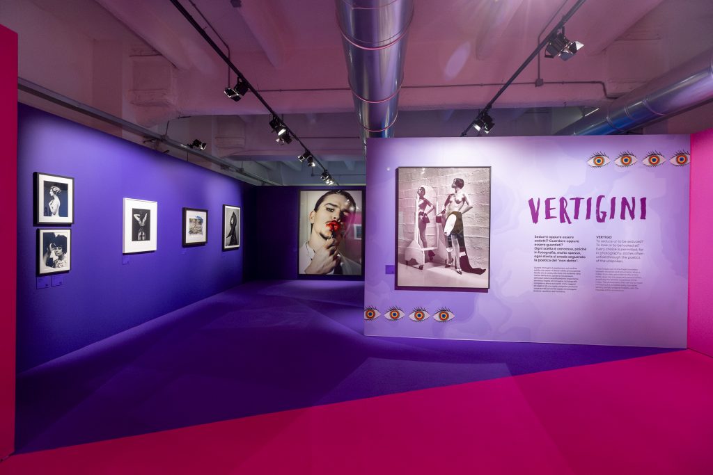 Vertigini, con opere di Horst P. Horst, Bill Ray, Tazio Secchiaroli, Gian Paolo Barbieri, Guy Bourdin, Jan Saudek, Robert Mapplethorpe, Peter Beard, Bettina Rheims, Ferdinando Scianna, Helmut Newton, Martin Schoeller e Mario Testino riflettono sul concetto di seduzione: come ricorda il significato etimologico, sedurre deriva da un latino, e significa condurre a sé. In questa sezione l’osservatore è ammaliato da immagini seducenti. Ma è più importante sedurre o essere sedotti? Magistrale lo scatto di Robert Mapplethorpe che raffigura Lisa Lyon (1981) in cui le forme leggiadre della modella accompagnano il visitatore verso la ricerca di un desiderio da attraversare. Nella sezione Labirinti sono esposte opere di Bill Brandt, Seydou Keïta, Miroslav Tichy, David Hockney, Lord Snowdon, Herb Ritts, Peter Hujar, Nan Goldin, Steven Meisel, Arno Rafae Minkkinen, Irina Ionesco, Erwin Olaf, Ren Hang, Toiletpaper. Ma la nostra attenzione si concentra su Nuovi Mondi in cui le opere di Juno Calypso, Maisie Cousins, Bodhi Shola, Weronika Gęsicka, Agata Wieczorek, Angelo Formato, Paolo Ventura, Carolyn Drake si pongono l’obiettivo di superare i limiti costituiti dalla forma, per esplorare mete e frontiere inattese su cui ridefinire nuovi confini.