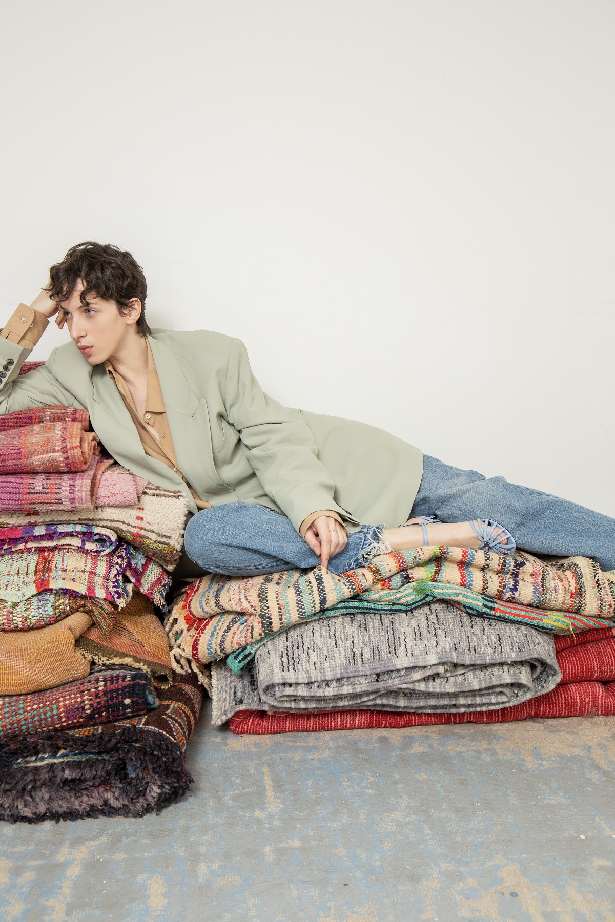 In altri casi, oltre al gioco di forme e materiali timeless, è l’accostamento per texture come nel look in cui una serie di tappeti di Paris Berbere, costruiti tramite recupero di tessuti vintage e sostenibili è stato accostato a un completo giacca e pantaloni di Dries Van Noten. Da questa idea è nato un vero dialogo tra forme e colori, giochi di superfici, reso possibile anche grazie allo spazio Galerie 20.80 di Parigi, galleria specializzata in oggetti di design e decorazione dal XX secolo. La scelta della stessa modella Camille (selezionata tramite uno street casting) vuole incarnare l’idea di una donna reale e contemporanea, che vive e dialoga con gli spazi in modo naturale, senza indulgere troppo in pose moda classiche.