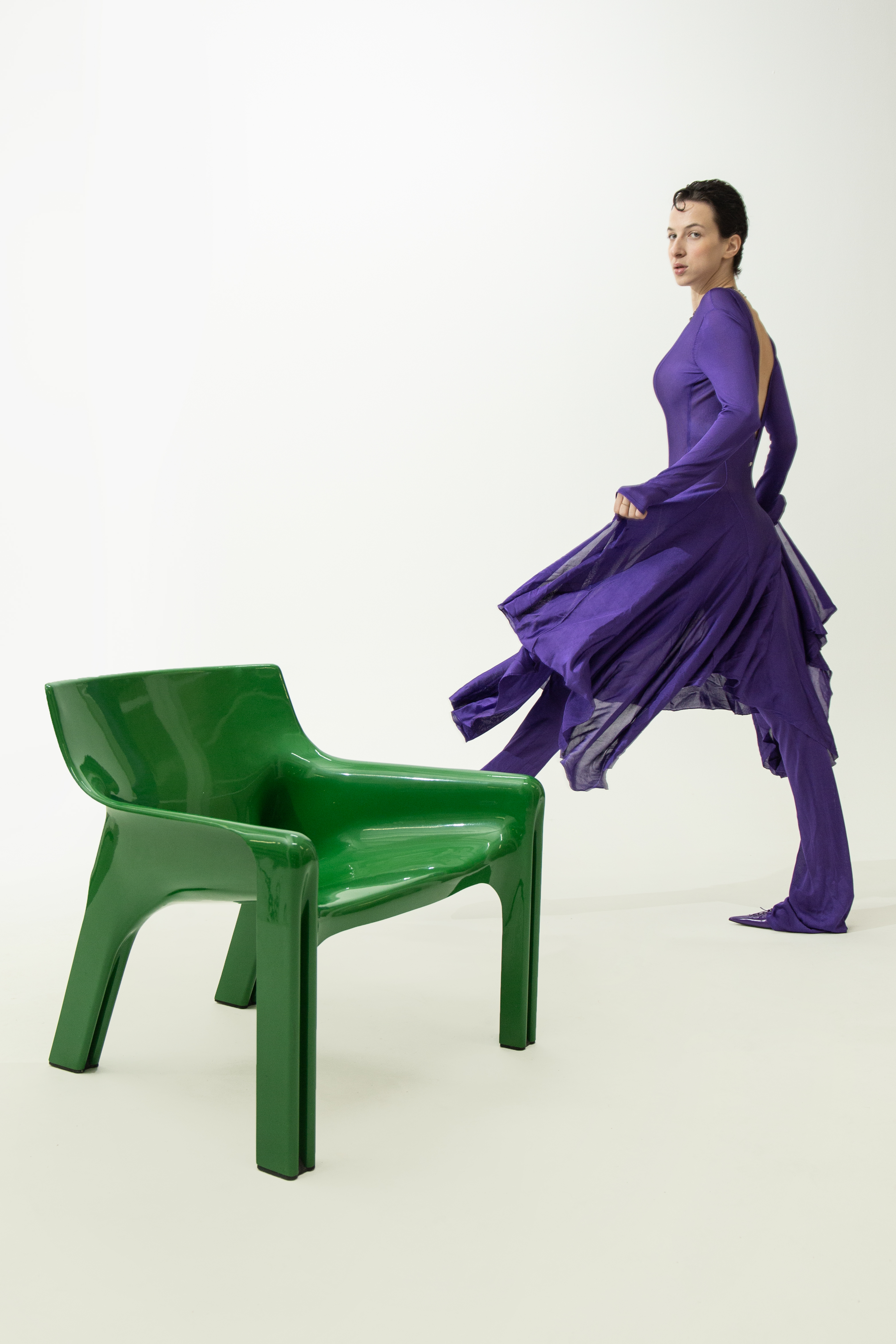 In occasione della Milano Design Week, exibart ha commissionato al fotografo Davide Carson un servizio fotografico in cui sono messi in dialogo alcuni pezzi di design anche storici con altrettanti look moda firmati da noti brand internazionali. Qual è il fil rouge che li lega? Sicuramente le linee essenziali e minimali che si ritrovano sia nella moda, sia nell’interior, come nel caso della poltrona verde di plastica firmata Vico Magistretti (1970 edizione Artemide) cui è stato accostato un abito fluido a schiena nuda di Versace. Uno stile che riesce ad andare oltre le tendenze moda e le epoche.