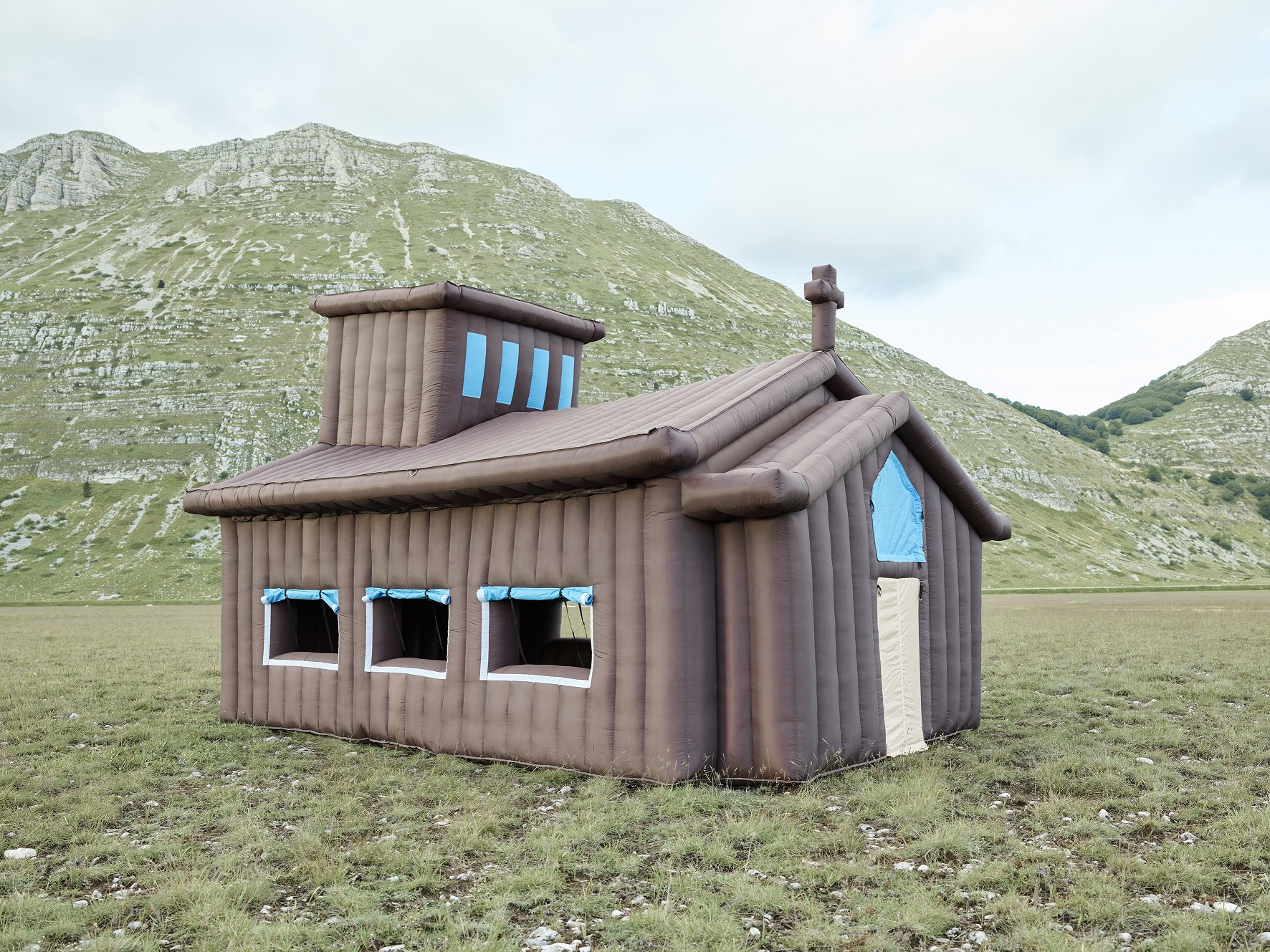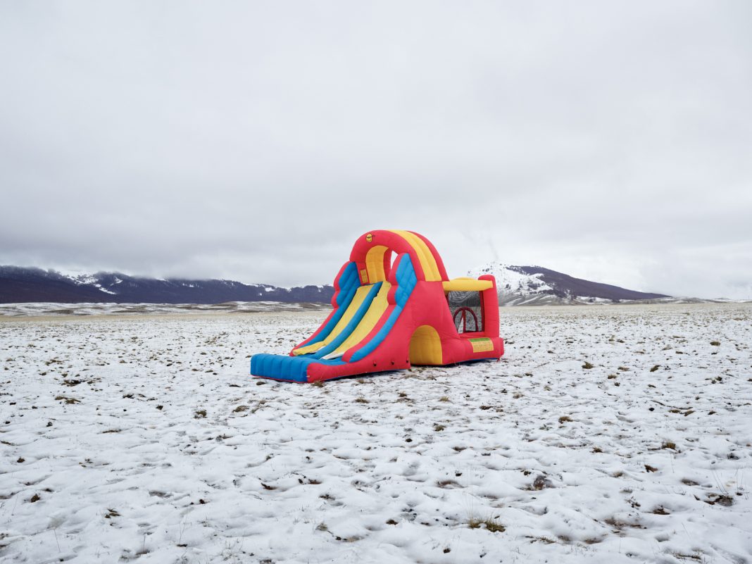 Paesaggi aspri, linee aguzze che spuntano da chiazze d’erba bassa, una natura forte, resistente. E poi, un elemento dall’opposta consistenza, un giocattolo gonfiabile dai colori accesi, castelli e scivoli, morbidi e accoglienti, dunque estranei, provenienti da un altro mondo, sviluppatisi in condizioni ambientali diverse. Così, con questi paradossi materici e insieme visivi, Stefano Cerio ha raccontato fotograficamente il territorio abruzzese colpito dal terremoto del 2009, concentrando l’obbiettivo, in particolare, sulle montagne circostanti L’Aquila. Già esposte in diverse occasioni, tra cui proprio al MAXXI l’Aquila e a giugno 2022 in una delle sedi dello Studio Trisorio a Napoli, le immagini di quel progetto sono andate a comporre una nuova pubblicazione edita da Hatje Cantz Verlag, storico editore di libri tedesco specializzato in fotografia, che già ha pubblicato altri cataloghi di Cerio.