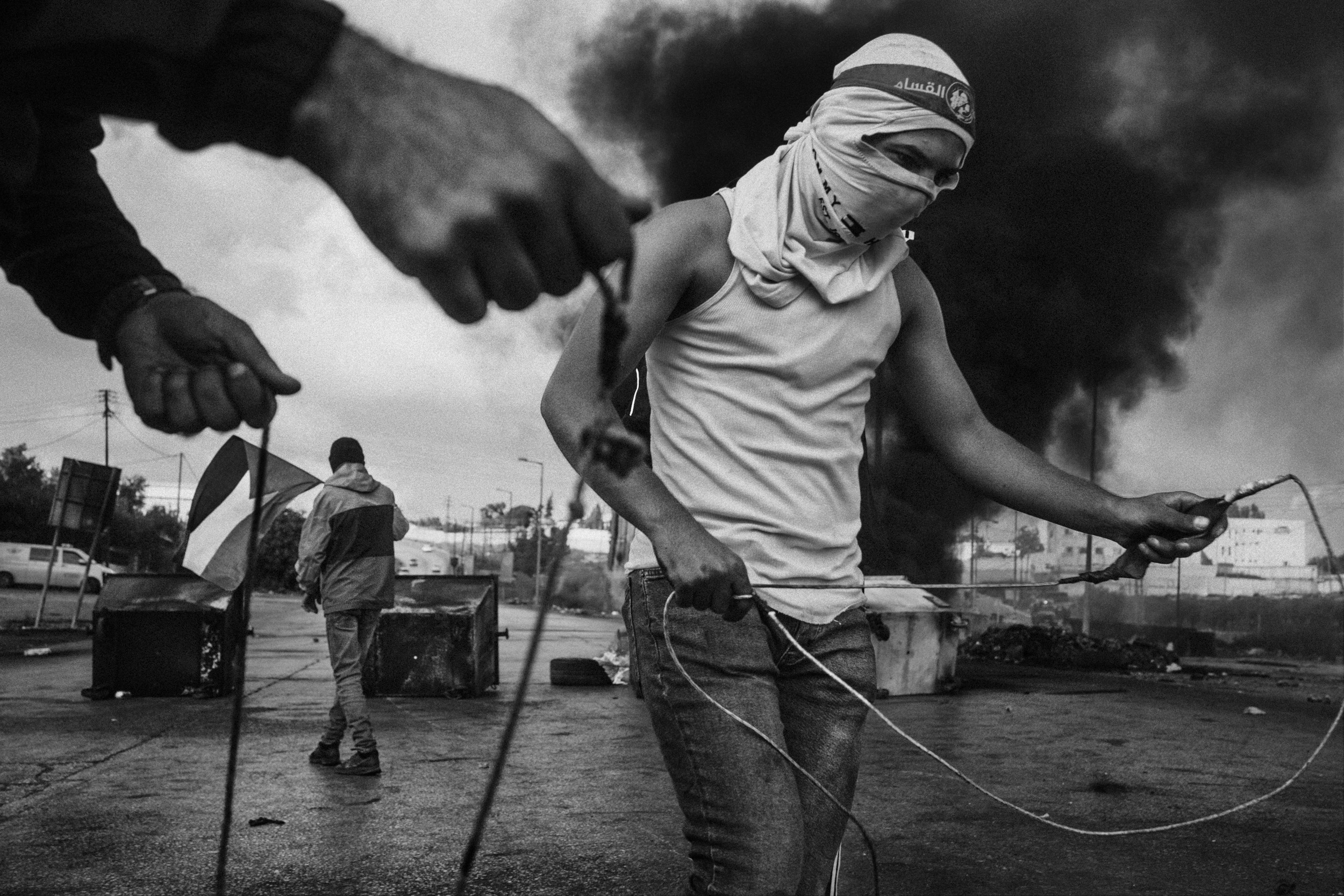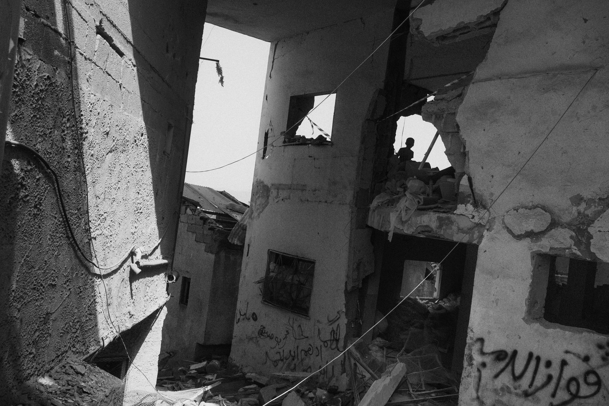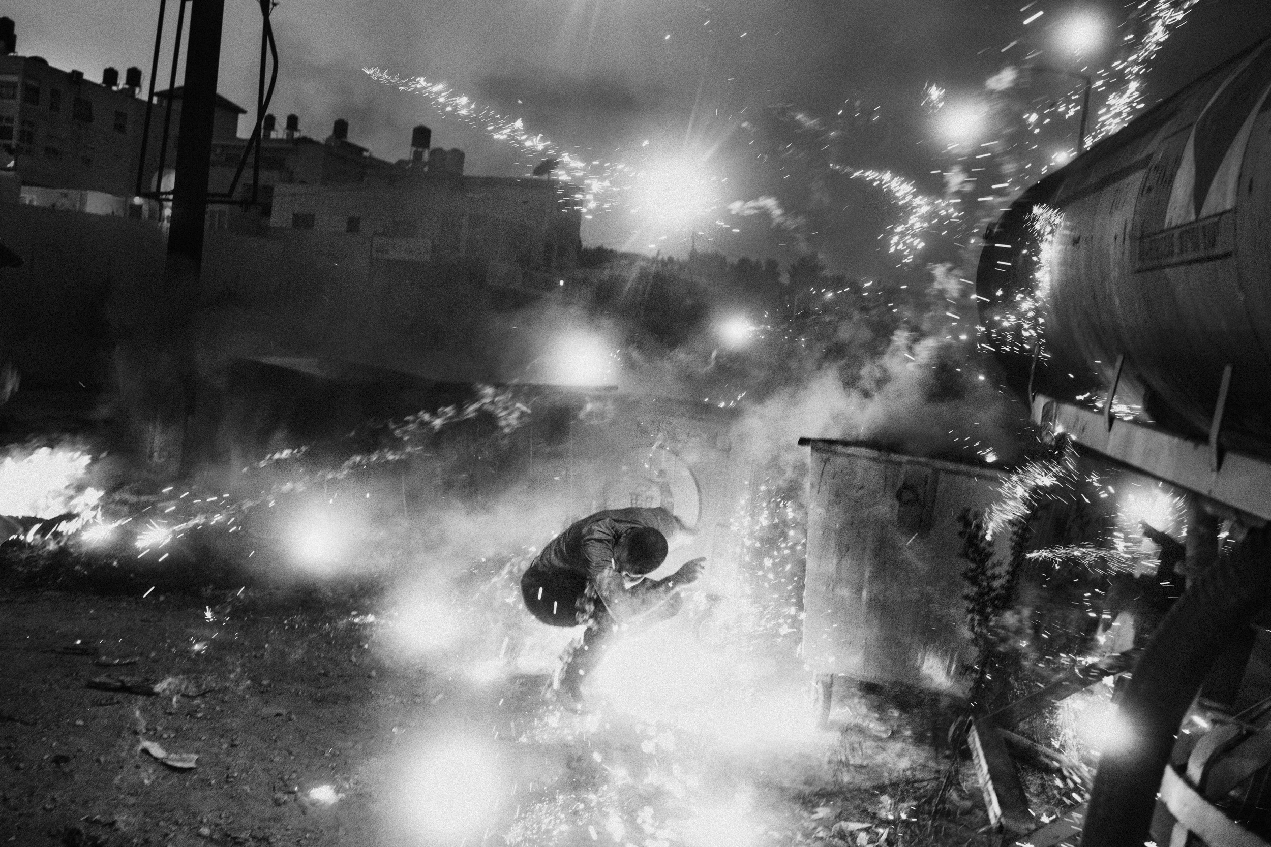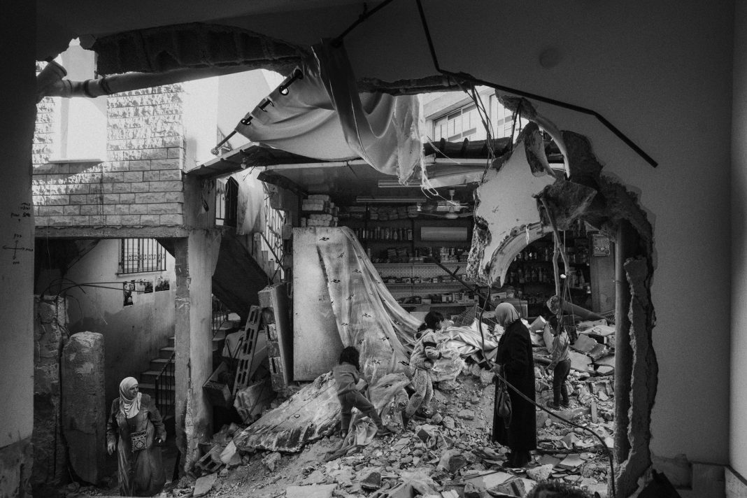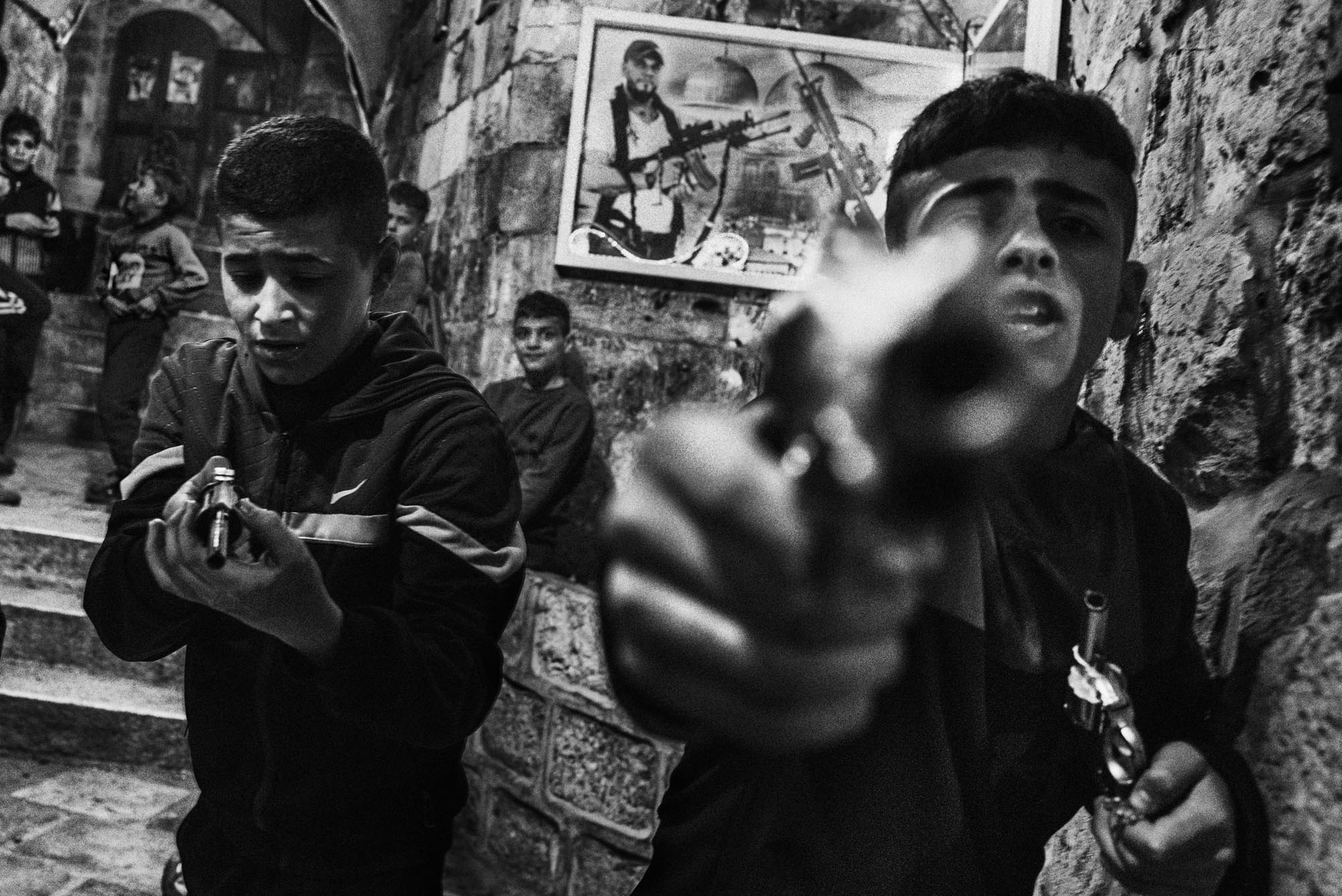 Nelle altre stanze, la potenza di queste foto ci porto dentro i mille aspetti di questo conflitto. Tra cui la vita quotidiana che non sembra possibile possa proseguire in questi luoghi distrutti. E così spiccano le foto dei bambini di Nablus che giocano con le pistole o l’abbraccio tra un padre e un figlio o i giovani che fumano il narghilè in un campo profughi di Jenin, tra le macerie di una post incursione dell’esercito di Israele. Così come un abitante di Umm al Kheir siede tra le rovine di una casa demolita dagli attacchi dell’esercito. Lo sguardo di Tugnoli non ci lascia immaginare, si “fa un racconto” di cosa vuol dire in termini di devastazione di luoghi e di vite questa guerra senza sosta. E senza giustizia.