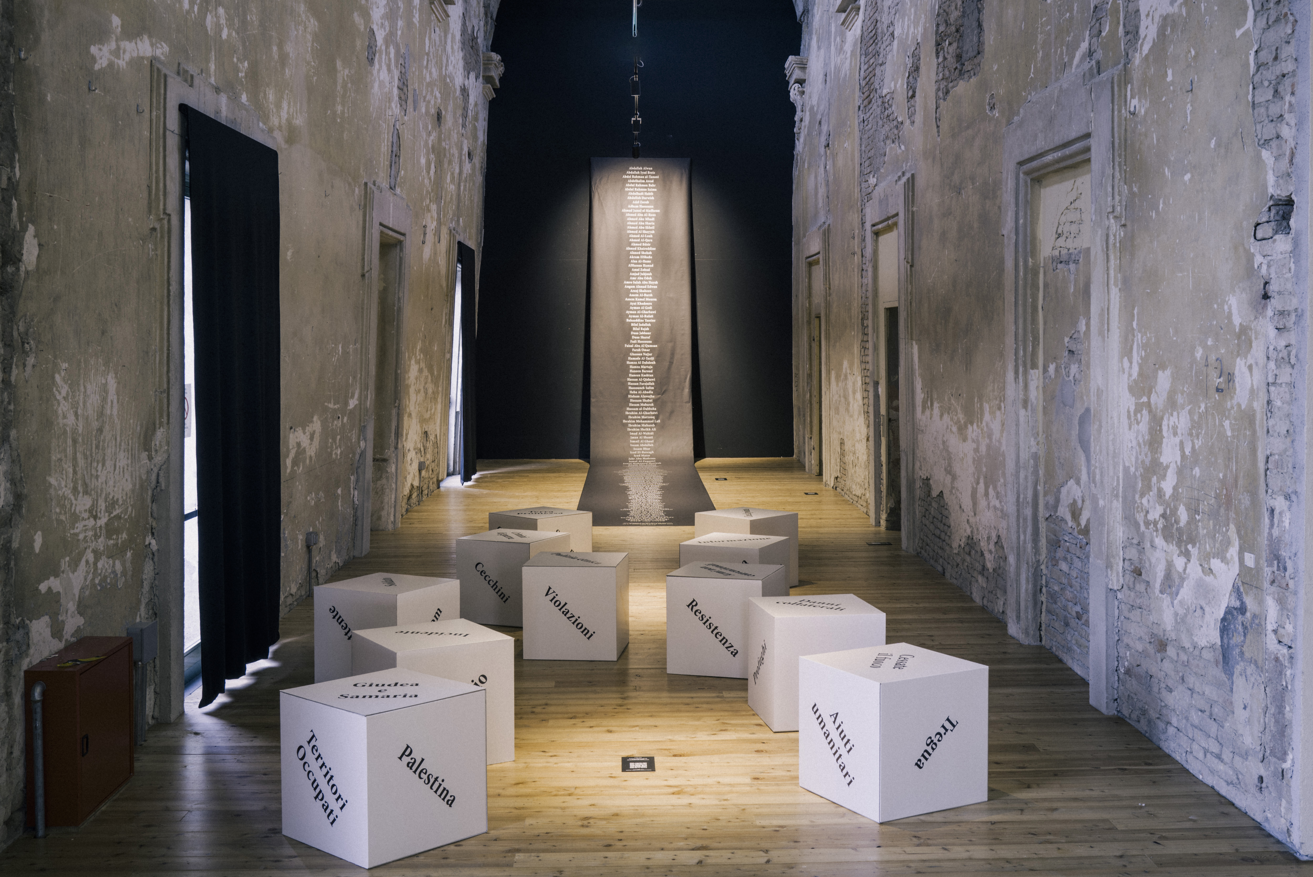 La poesia ci accoglie sul pianerottolo mentre saliamo al piano dove si trova l’esposizione. Da qui vediamo anche, al termine della seconda rampa di scale, una lunga striscia nera appesa al muro con molti nomi scritti in bianco: sono i giornalisti palestinesi uccisi negli ultimi due anni. E subito sotto: una manciata di dadi dove per ogni lato c’è una parola – confini, popolo, muri genocidio, guerra, tragedia, convenzioni e molte altre. Dadi gettati senza nessun regole e rispetto come è quello che manca in questa tragedia senza sosta.