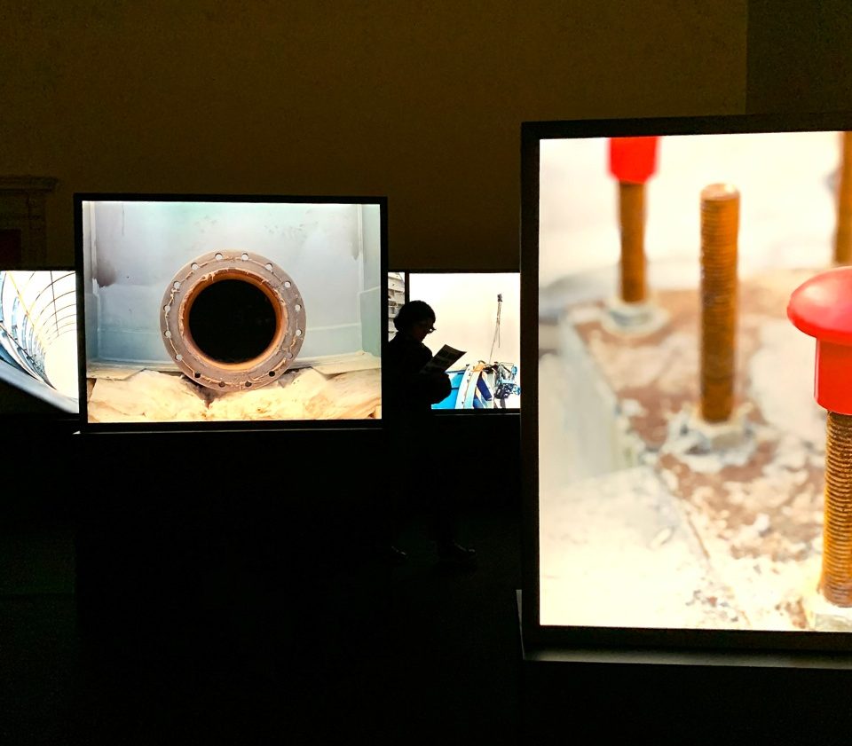 Silvia Camporesi ha il merito di farcelo capire, facendo assumere completo valore autonomo alla lanugine del vetro, con la sua consistenza impalpabile, alla ruggine dei bulloni, all’increspatura dei tubi di plastica, alla lordura degli stracci rosa, alla montagna di rifiuti organici, all’argento delle tubazioni metalliche. Compare l’uomo come elemento di vita e allo stesso tempo cervello e propulsore delle operazioni niella vastità dei paesaggi composti solo da metallo e luce. Dettagli inaspettati ci accolgono, in una sublime nitidezza di particolari enfatizzati dalla luminosità degli schermi.