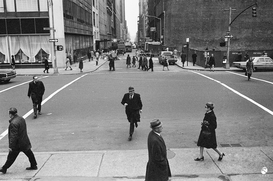 La sua composizione, pur nella velocità di scatto che richiede la street photography, è rigorosissima, mai artificiosa: è il risultato dei suoi studi sull’arte, della passione per la pittura e degli anni trascorsi da visitatore nei musei. Gli ingrandimenti dei provini presenti in mostra su grandi pannelli retroilluminati ci raccontano del processo di selezione e di scarto e simulano il piano luminoso usato dai fotografi per trovare l’immagine perfetta. Un processo che hanno fatto gli stessi curatori Guidi e Mirabella, nel momento in cui hanno deciso di proporre nel percorso espositivo, accanto alle 12 stampe vintage, fotografie inedite e stampate per l’occasione da Fotosciamanna di Sergio Casella.
