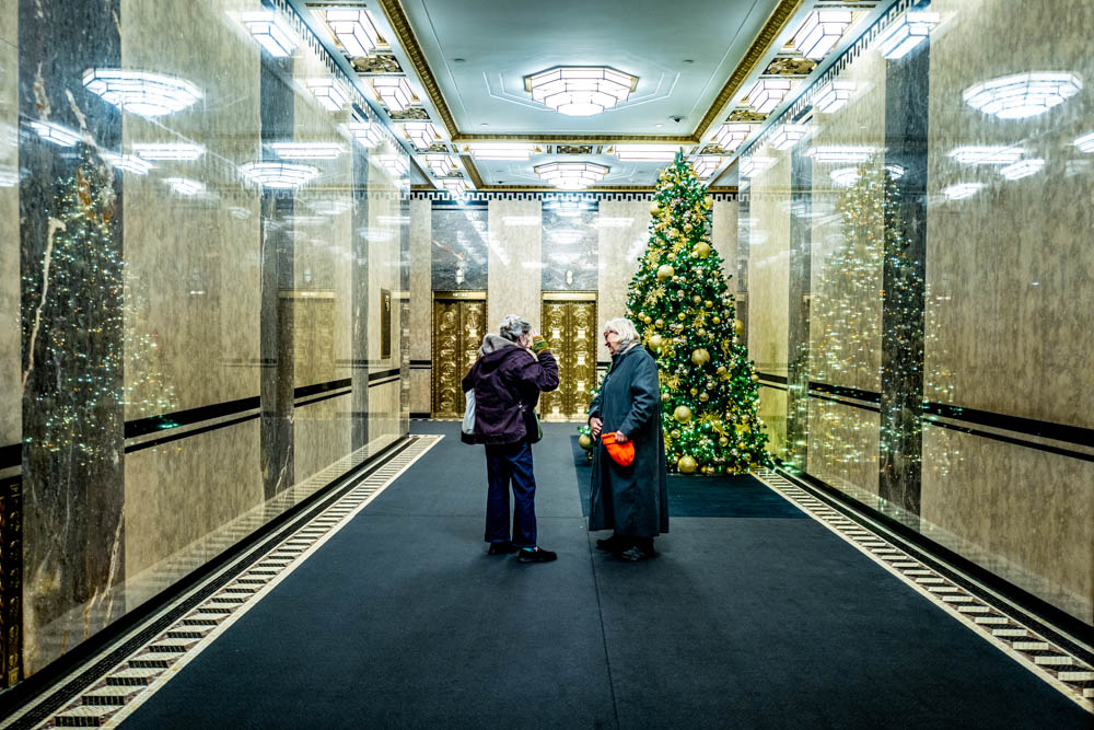 In questo momento l’atrio è occupato da un grande albero di Natale che accoglie i visitatori. All’ottavo piano c’è la mostra fotografica di Danny Lyon alla Greenberg Gallery. Abbiamo conosciuto il fotografo durante il vernissage della sua mostra The Texas Prison Photographs, visitavile fino al 31 gennaio. Danny Lyon ha rivoluzionato la fotografia documentaria negli anni ’60 con un approccio partecipativo radicale, in particolare nel movimento per i diritti civili e con il club motociclistico Chicago Outlaws, che ha portato alla realizzazione del libro The Bikeriders. Il suo stile di New Journalism prevedeva il coinvolgimento in prima persona, come lui stesso ha spiegato: «Ero un partecipante che era anche un fotografo».