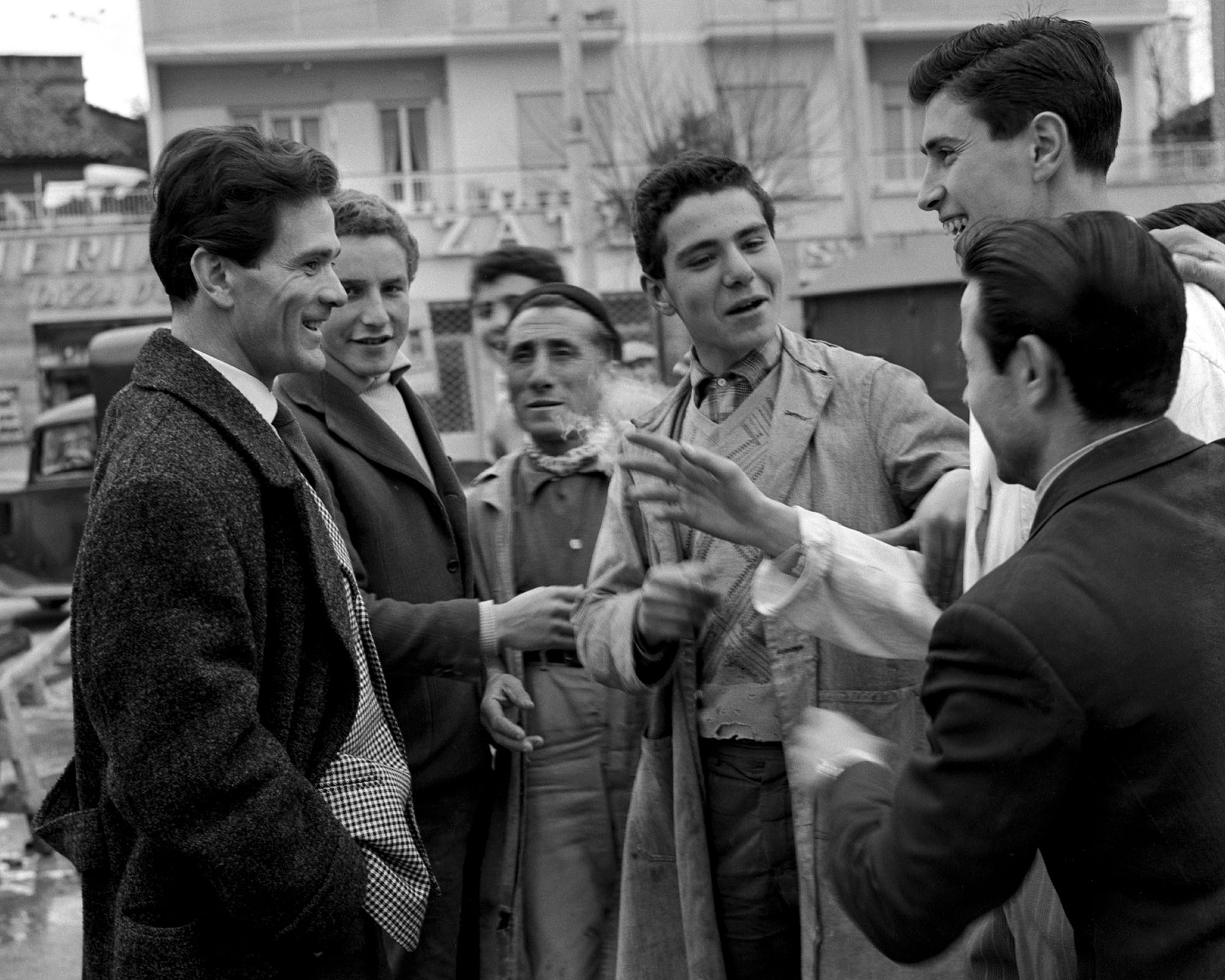 Meravigliosi ritratti di un trentaseienne Pasolini, sorridente e profuso in quell’umanità ai margini di cui si è fatto portavoce in gran parte della sua opera. Riprese in medio formato che lo immortalano insieme agli abitanti del quartiere nella desolazione di palazzi in costruzione per la speculazione edilizia, in un mercato rionale e all’interno, festante, di una sala biliardo. Insieme alle fotografie, anche i provini a contatto originali e riproduzioni di documenti dattiloscritti e manoscritti, con appunti, scambi e revisioni apportate alle sceneggiature dei loro cortometraggi. Mangini si relazionerà con Pasolini anche per “Stendalì – Suonano ancora” nel 1960 e “La canta delle marane” nel 1962, con l’intenzione poetica comune di raccontare le disuguaglianze, a Roma come in Salento, con l’evolversi della cultura rituale contadina verso una più misera e devastante cultura industriale consumistica.