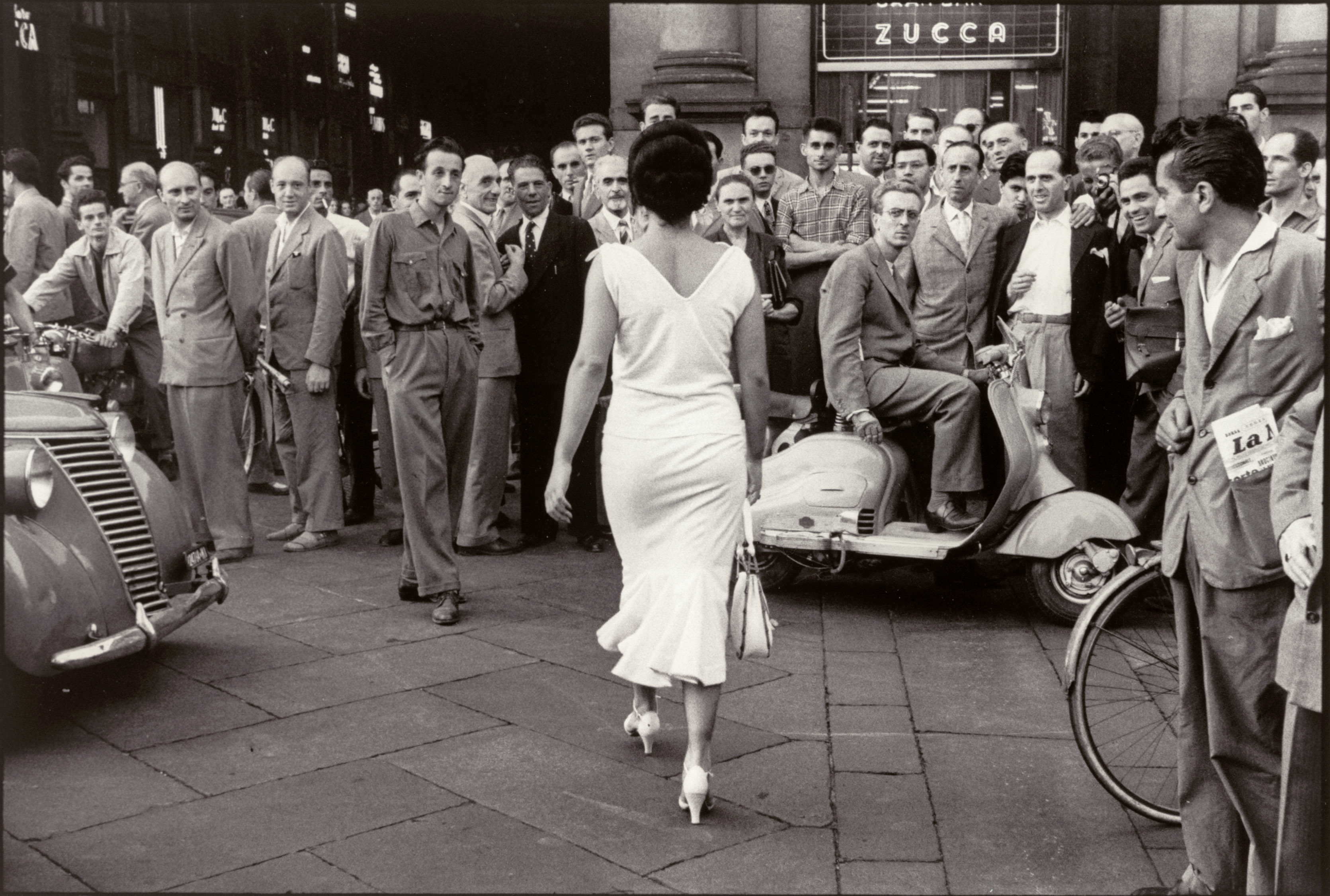 Dai capolavori che hanno fatto la storia della fotografia internazionale come «La strada per Palermo», realizzata da Robert Capa nel 1943, «American girl in Italy, Firenze» di Ruth Orkin del 1951, e il reportage dedicato all’Italia da Henri Cartier-Bresson nel 1952. «Gli italiani si voltano» (1954) di Mario De Biasi, dove un gruppo di uomini ammira la bellezza di Moira Orfei che passeggia per le strade di Milano, i due amanti appartati fra le dune di un lido veneziano, scovati da Gianni Berengo Gardin nel 1958, «Palermo, via S. Agostino» (1960) di Enzo Sellerio, che ritrae una coppia di bambini trasportare due sedie sopra la testa, gli iconici seminaristi che giocano nella neve, ritratti da Mario Giacomelli nel 1961, la serie «Mondo Cocktail», realizzata da Carla Cerati all’inizio degli anni Settanta durante le inaugurazioni di gallerie d’arte e negozi della Milano bene.