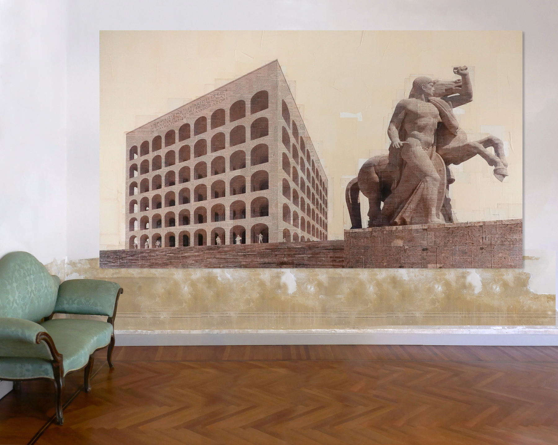 «La mostra è nata da un incontro, Amanda Gesualdi nel bellissimo testo introduttivo lo ha definito “magico”, tra la Villa e le Opere del progetto Palazzi di Parole, che nascono a poca distanza da questo affascinante e importante edificio del tessuto urbano di Imbersago. Palazzi di Parole, nel corso degli ultimi anni, ha analizzato e raccolto immagini di architetture d’Italia e d’Europa, utilizzando una particolare tecnica messa a punto per l’occasione: una stampa fotografica realizzata su collage di pagine di libri.