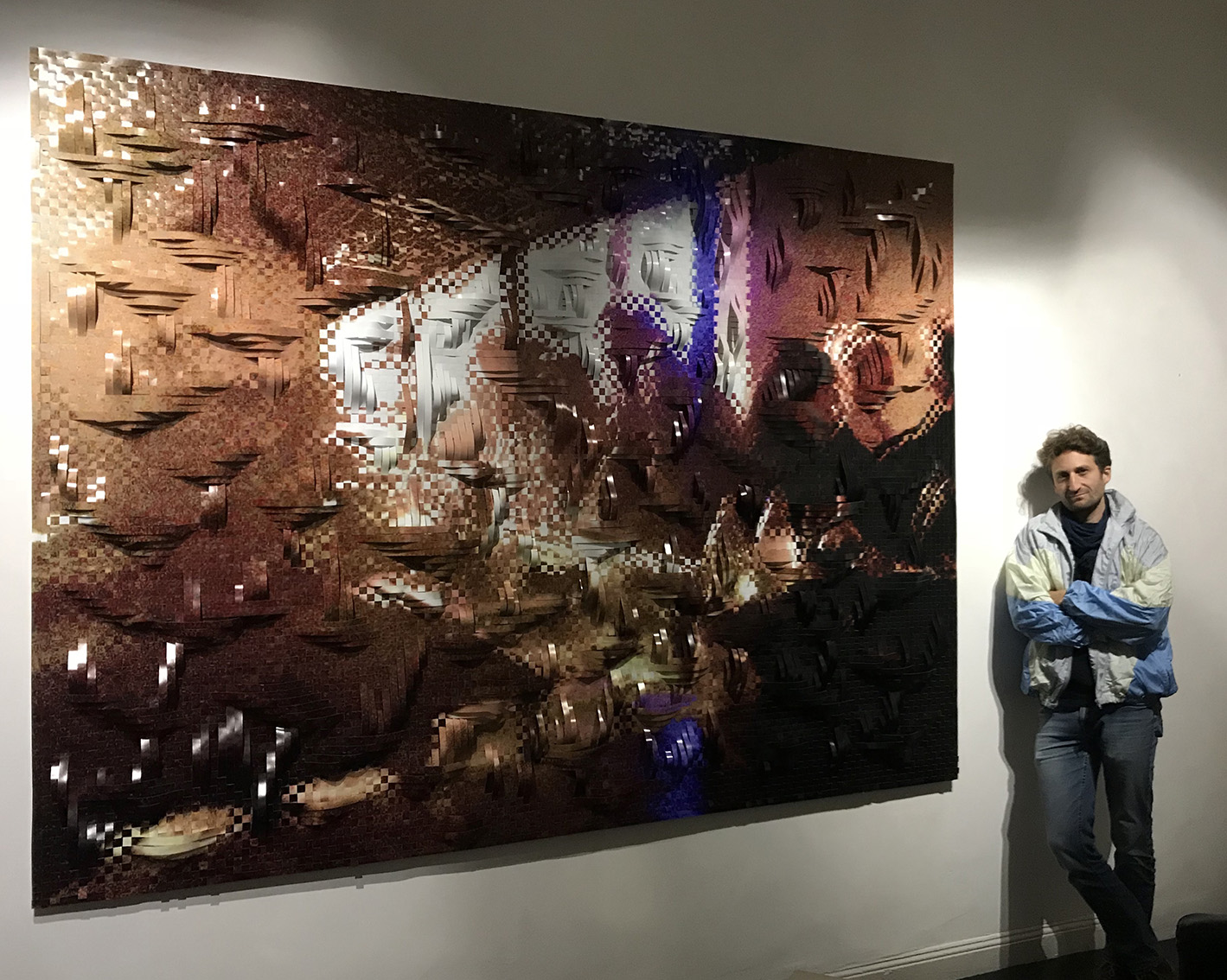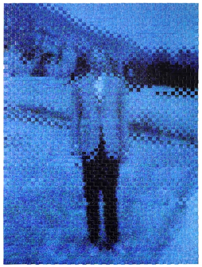 Altri pezzi combinano le stampe con materiali come lamine o tessuti, o giocano con la prospettiva dell’immagine, tagliando la fotografia verso il punto di fuga e spostando le strisce lungo le linee prospettiche. Di conseguenza, l’immagine viene distorta e pixelata manualmente, questa pratica si pone alla base della formazione delle sue immagini digitali.