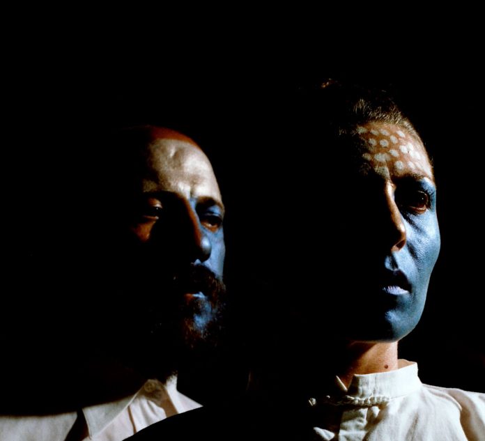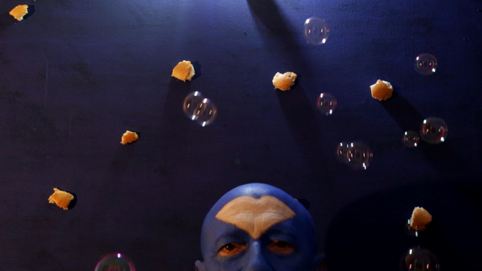 L’immagine in primo piano dei volti s’identifica con il cielo a tal punto da diventare essa stessa cielo – il bianco e il blu sui volti ne sintetizzano i suoi elementi. Mentre le pose rispondono al motivo della rotazione dei pianeti. Il riferimento è ai corpi celesti e al movimento del cosmo. Qui l’invenzione del cosmo passa attraverso l’elaborazione e la trasfigurazione degli elementi della vita personale quotidiana dell’artista. Così come avviene per l’installazione del 2021.