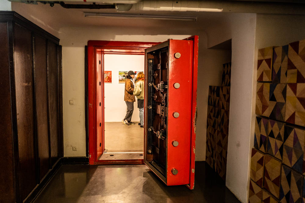 A noi sono piaciute in particolare le foto di Barbara Wolff, perché ha fotografato molti luohji che ben conosciamo. La fotografa osserva gli abitanti di Berlino e New York nei loro rituali alla ricerca di un nuovo centro spirituale, come lo yoga di massa a Times Square o un luogo di riposo “consacrato” per i senzatetto sotto le ali dipinte dall’artista Colette Miller. Wolff nel giugno 2023 ha passato un mese a New York e al suo ritorno ha pubblicato un libro. Molto suggestiva la sala al piano inferiore che ha come porta lo sportello dell’ex cassaforte.