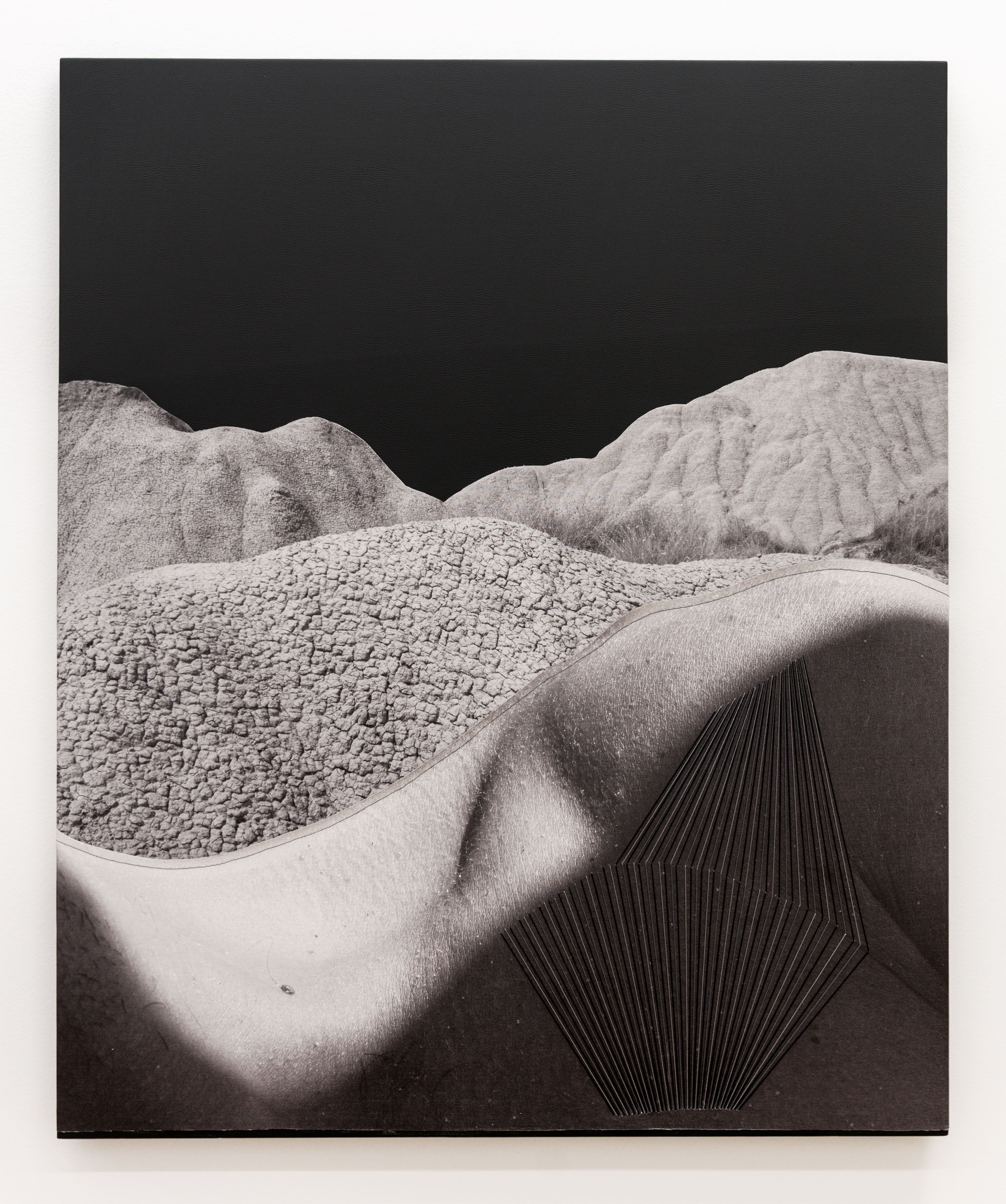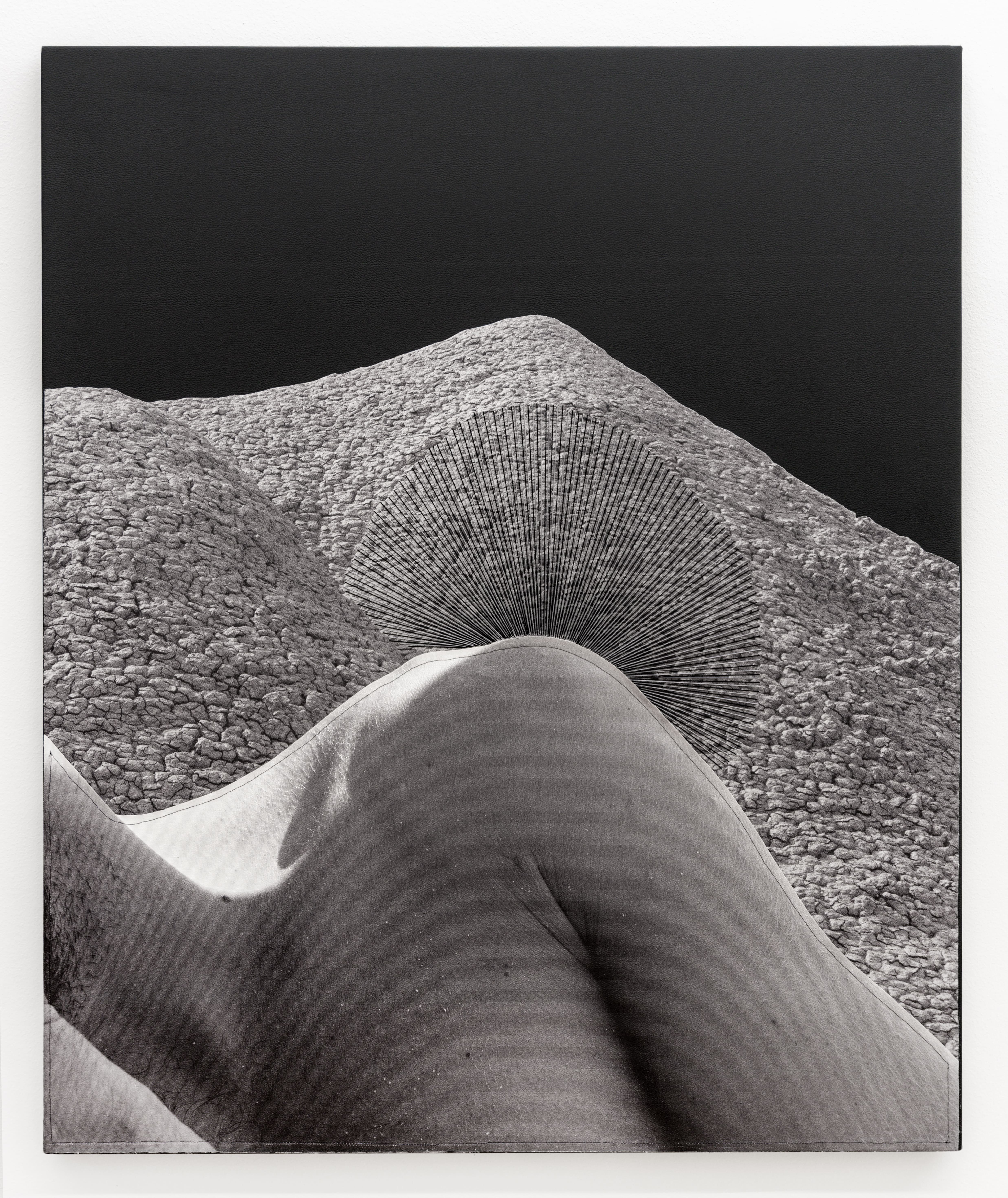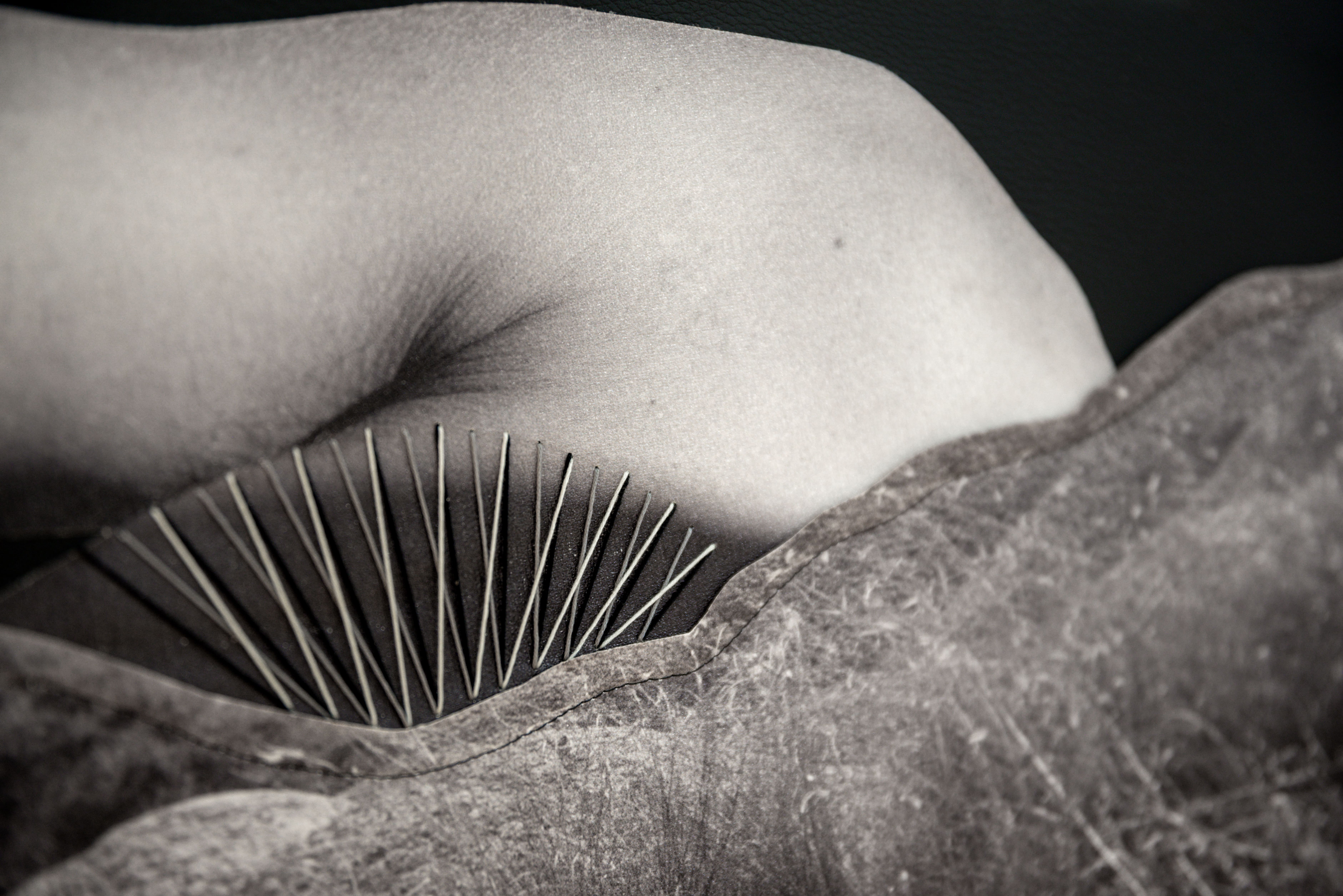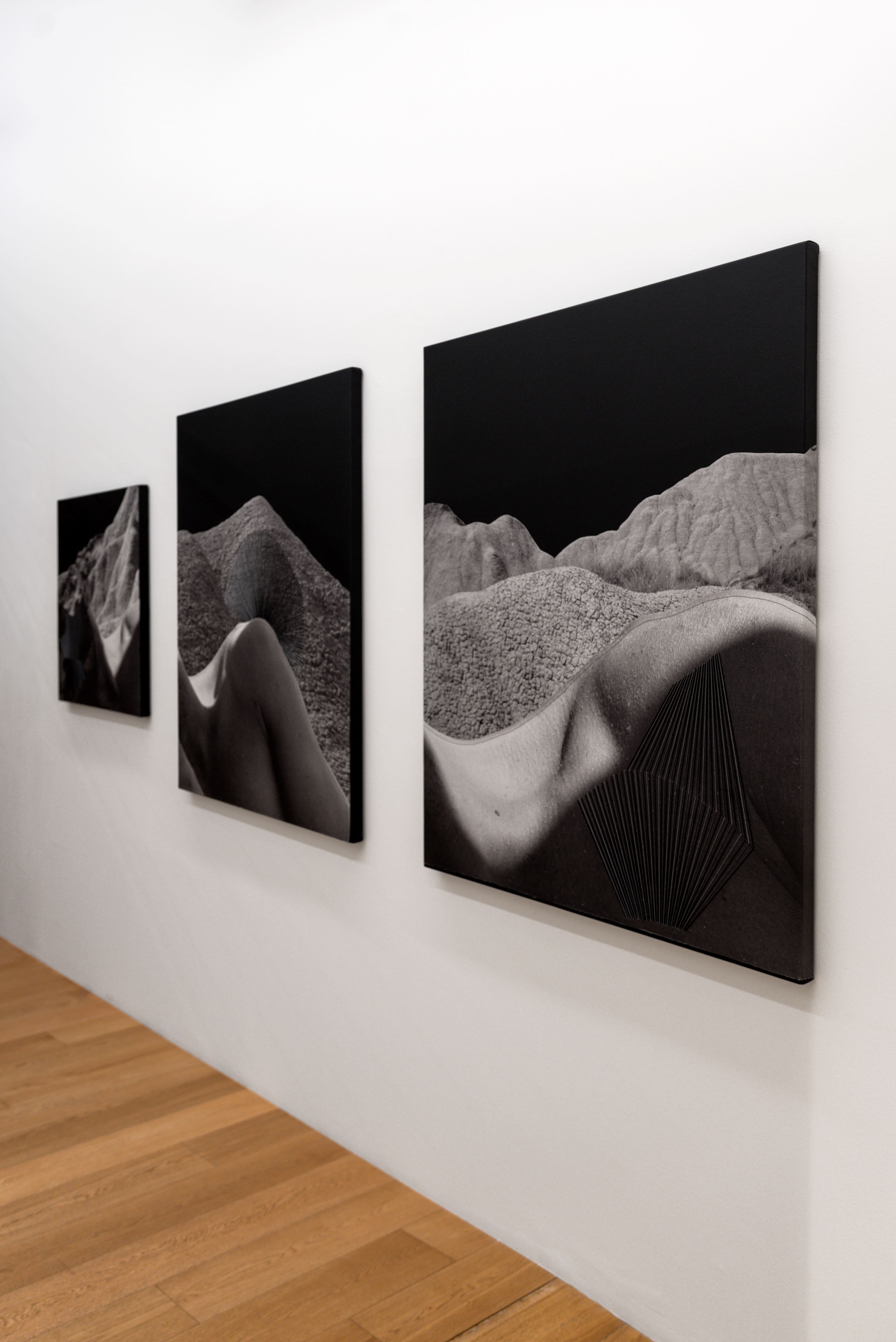 L’artista lavora su collage fotografici realizzati da lei stessa, cucendo parti del corpo al paesaggio. Ventagli, dorsali e costolature si innestano nei luoghi, seguendone le forme e trasformandosi in mappe tattili in cui corpo e territorio diventano un tutt’uno. La stampa su ecopelle richiama l’epidermide, la sua trama assorbe il grigio e rende le immagini delicate e quasi tattili, come se volessero essere toccate.