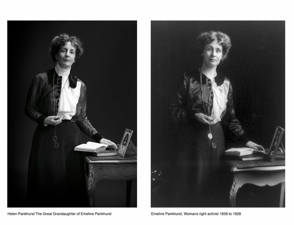 È importante per Gardner che ci sia anche una certa somiglianza estetica e che i due soggetti abbiano all’incirca la stessa età: «ci dev’essere qualcosa di magico», ha detto il fotografo. In questo senso uno dei ritratti meglio riusciti è sicuramente quello di Helen Pankhurst e della sua bisnonna Emmeline Pankhurst, attivista politica britannica che aiutò le donne inglesi a ottenere il diritto di voto. Mettendo a confronto la fotografia di Helen con quella della sua antenata, è subito evidente la loro somiglianza, quasi come se si trattasse di due sorelle.