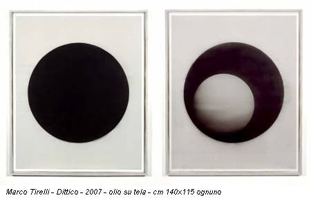 “Più di ogni altra forma di superficie, il cerchio tende verso la quiete incolore, perché non conosce la violenza dell’angolo. Il punto centrale del cerchio è, quindi, la quiete più perfetta del punto non più isolato”. Le parole di Kandinsky sembrano calzare perfettamente al dittico di Marco Tirelli, dove i volumi sferici emergono dallo sfondo d’ombra e si fanno generatori di uno spazio tridimensionale dominato dal rigore geometrico, dall’equilibrio e dall’armonia della forma.