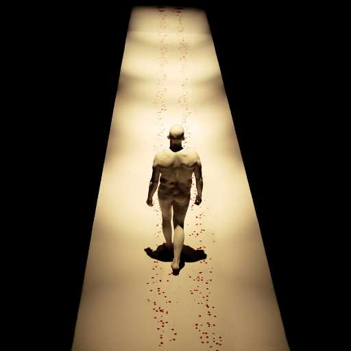Ma il lavoro con il proprio corpo e con il sangue che egli dichiara essere “qualsiasi cosa” non è certo terminato. A dimostrare il “profondo senso di libertà” veicolato dal fluido rosso ecco delle eccezionali foto (lambda print) di formato quadrato delle proprie esibizioni. La sua passerella in una lingua di stoffa immersa nel buio tetro sembra non lasciare scampo ad alcuna forma di velleità umana. Il contrasto tra la pelle dipinta di bianco e le gocce di sangue è toccante ed il senso del martirio sembra sostantificare la massima artistico-filosofica del sanguino ergo sum.