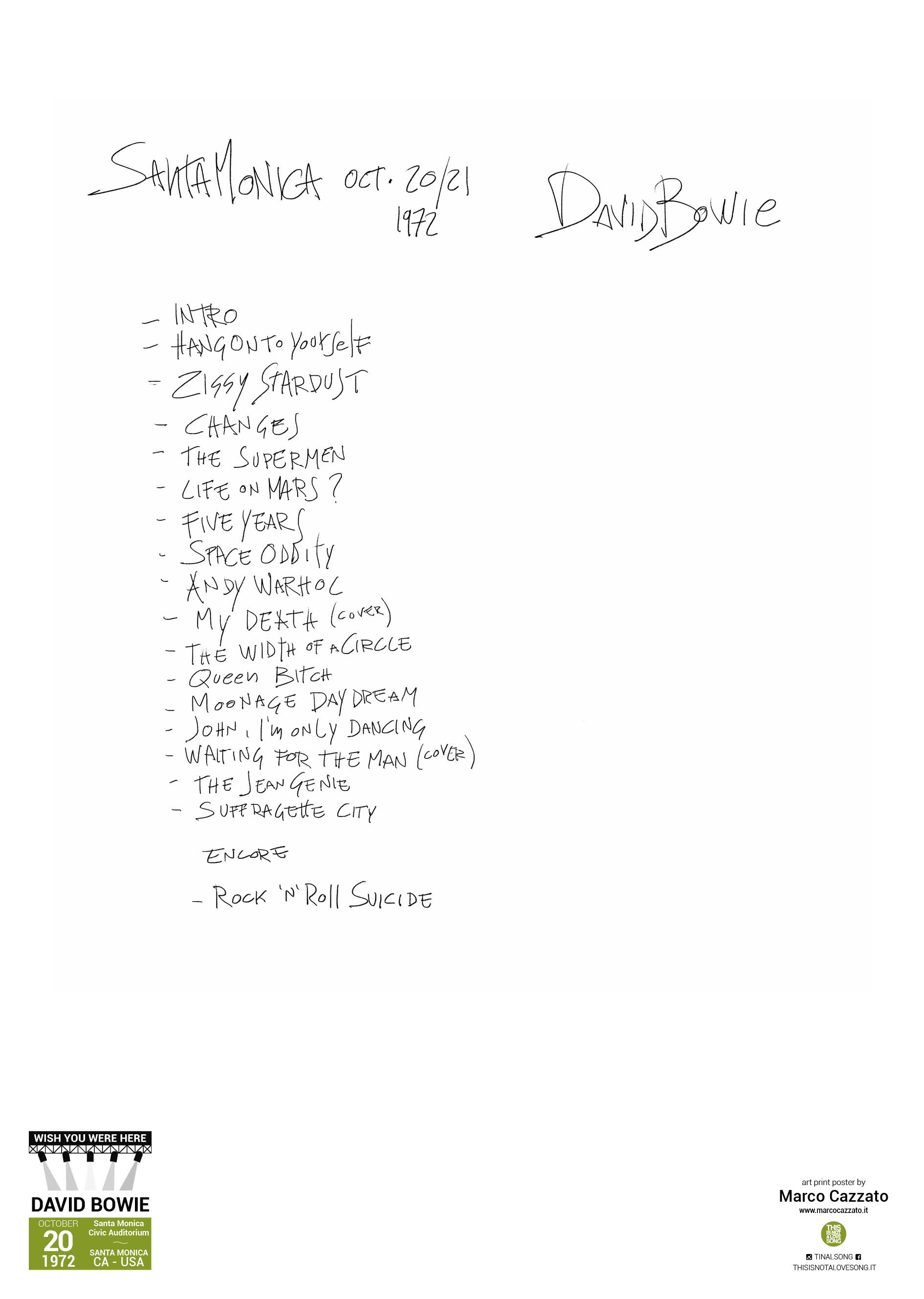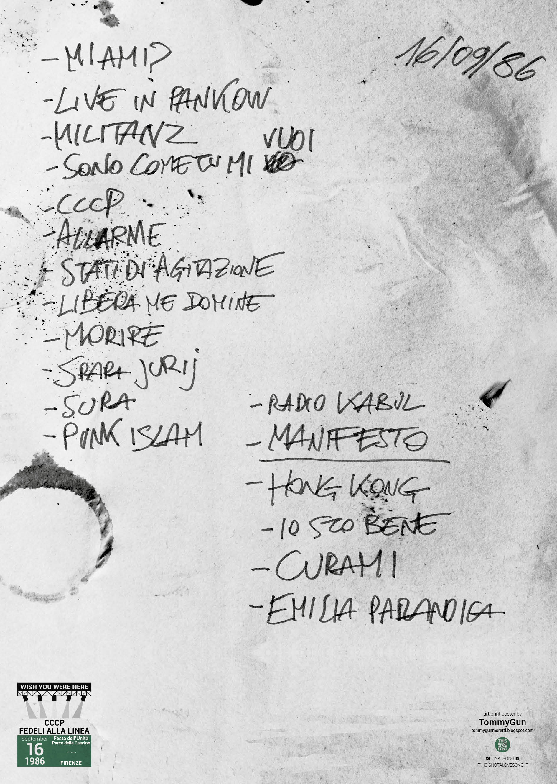 32 biglietti di 32 concerti epocali che, al loro interno, racchiudono 32 manifesti esclusivi, illustrati da 32 tra i migliori fumettisti italiani. Il tutto in sostegno di dieci live club, grazie a un crowdfunding attivo fino al 30 giugno su Produzioni dal Basso. David Bowie, De André + PFM, Smiths, Jeff Buckley, Pearl Jam, Britney Spears, Daft Punk, R.E.M. + Radiohead, Bikini Kill, Black Flag, Nico, Fugazi, Bruce Springsteen, Boards Of Canada, Nina Simone, sono tra i protagonisti dei concerti immortalati, per “WISH YOU WERE HERE”, dai alcuni dei nomi più conosciuti e delle nuove promesse più interessanti del fumetto italiano: Alessandro Baronciani, Nova, Enrico Pantani, Eliana Albertini, Marco Cazzato, Antonio Pronostico, Ludovica Fantetti, Paolo Bacilieri, Elisa Caroli, Serena Schinaia, Vit Moretta, Davide Bart Salvemini, Viola Niccolai, Grazia Sacchi, Hurricane Ivan, Giulia Pex, TommyGun, Stefano Zattera, Isabella Bersellini, Samuele Canestrari, Officina Infernale, Testi Manifesti, tra gli alti.