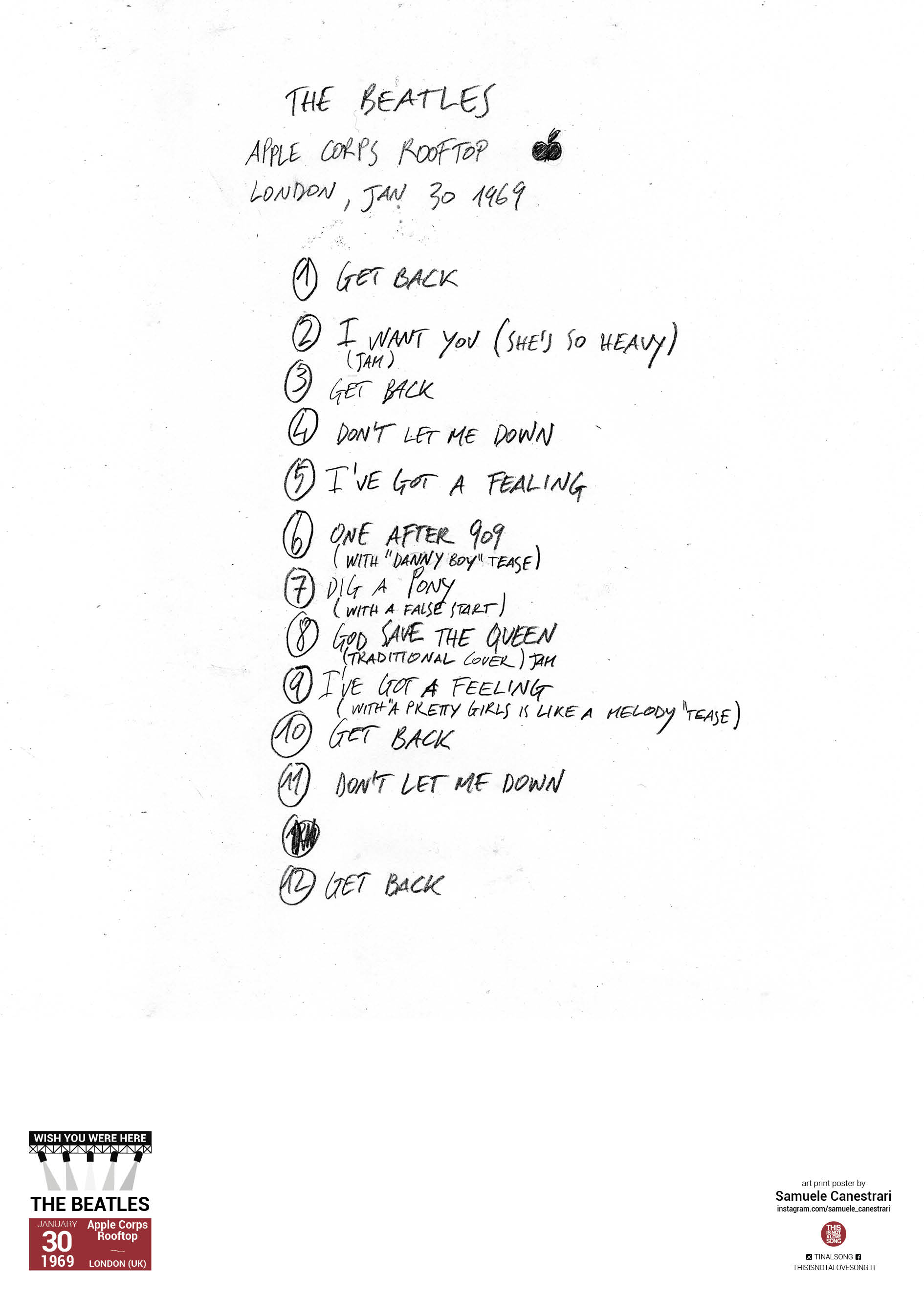 Il concerto dei Beatles sul tetto, a Londra, nel 1969. E poi quello dei Pink Floyd nella Laguna di Venezia, nel 1989. Ma anche i Queen nello stadio di Wembley, nel 1986 e i Nirvana al Bloom di Mezzago, in provincia di Milano, nel 1991. E poi i Cure a Parigi, nel 1992, e i CCCP Fedeli alla linea al parco della Cascine di Firenze, nel 1986, anche se poi non riuscirono a portarlo a termine. Insomma, la storia è fatta di concerti dal vivo e probabilmente non abbiamo potuto partecipare a tutti ma è importante ricordare la loro importanza, soprattutto di questi tempi non tanto felici per i grandi incontri tra persone accomunate da una passione da condividere, chiamati anche assembramenti. Perché tutto intorno a quella musica cantata e suonata e ascoltata così da vicino, ci sono le storie di ognuno di noi, grandi e piccole. Storie che rivivremo con i 32 biglietti d’autore di “WISH YOU WERE HERE”, il nuovo progetto ideato da THIS IS NOT A LOVE SONG e dedicato ai live che hanno fatto la storia della Musica, quei concerti ai quali tutti avremmo voluto assistere.