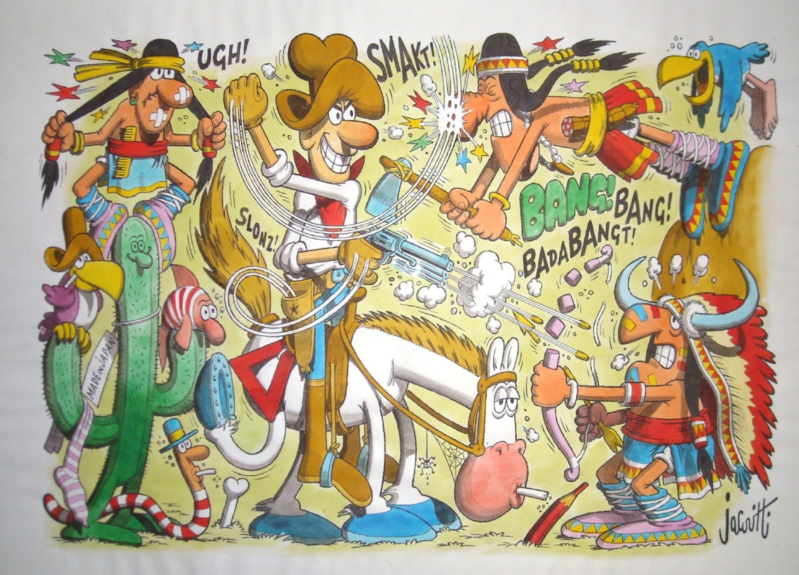 Dagli scalmanati 3P Pippo, Pertica e Palla, comparsi per la prima volta nel 1940, al celebre cowboy Cocco Bill, pubblicato verso la fine degli anni Cinquanta, le storie surreali di Jac sono costellate di personaggi e oggetti come le controverse sigarette e le barchette di carta. Non bisogna poi dimenticare i salami “umanizzati”, inseriti originariamente per riempire gli spazi vuoti e, in seguito alle numerose domande sul perché di quella scelta, in segno di scherzo. Umorismo e ironia si mescolano, dunque, nelle strisce cromaticamente dense che toccano tra l’altro anche tematiche politiche: il dopoguerra, il boom economico, le contestazioni degli anni Settanta fino ad arrivare alla contemporaneità.