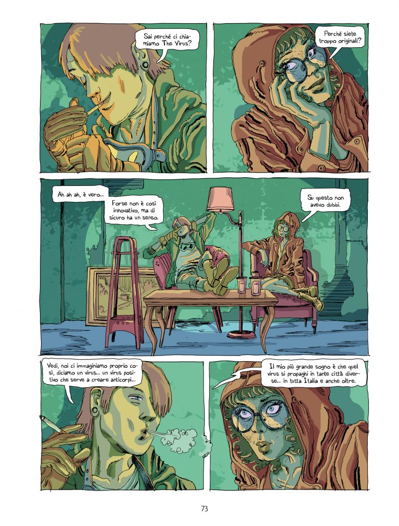 «Ciao a te e ai lettori di exibart. L’idea è nata ormai due anni fa, forse di più. Lo dico per evitare che si pensi sia un instant book nato durante il lockdown, dato che in qualche maniera parlo di virus. Questo fumetto unisce diverse idee e ragionamenti che periodicamente mi appunto, ormai non più sul taccuino, ma sul telefono o sul computer, su un foglio elettronico, insomma.