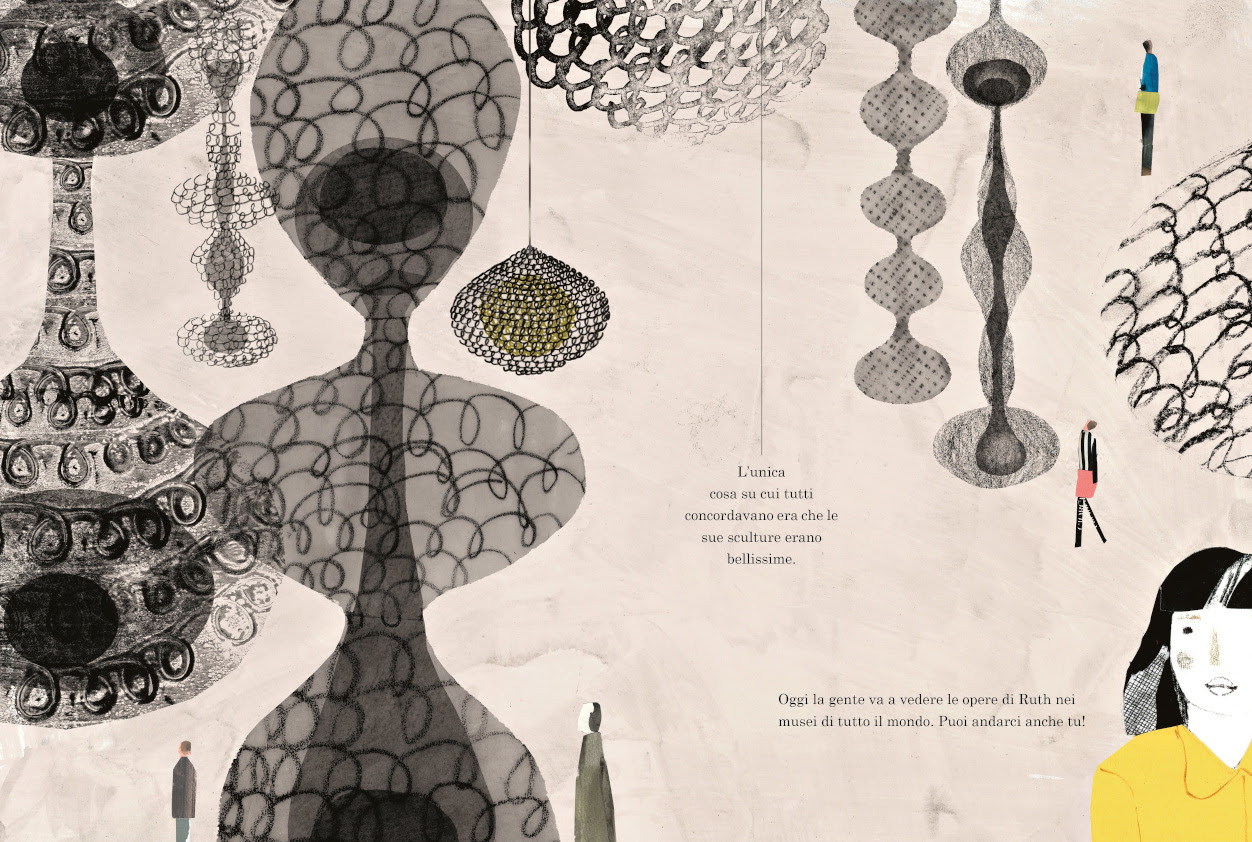 In un cartonato di poco più di quaranta pagine, l’albo illustrato propone un excursus di tutti quei momenti che, in modo differente, sono stati rilevanti all’interno della vita e dell’arte di Ruth, dall’apprendimento della lingua e della cultura giapponese, alla frequentazione del Black Mountain College sotto la guida di artisti e pensatori d’avanguardia come Robert Rauschenberg (Port Arthur, 1925 – Captiva, 2008), Merce Cunningham (Centralia, 1919 – Manhattan, 2009), Richard Buckminster Fuller (Milton, 1895 – Los Angeles, 1983) e Josef Albers (Bottrop, 1888 – New Haven, 1976). Quest’ultimo educa gli studenti a una forma di creazione “onnivora” e composta da più materiali possibili dato che, come afferma il pittore tedesco, ognuno di essi possiede la propria importanza, «Basta solo guardarli in modo diverso».