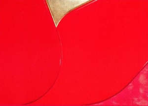 Di forte impatto emotivo le tele a grandezza monumentale, dove i colori accesi: rosso, nero, bianco, ( ma anche azzurro e verde) uniti alla foglie d’oro si compongono in astratte geometrie. La
